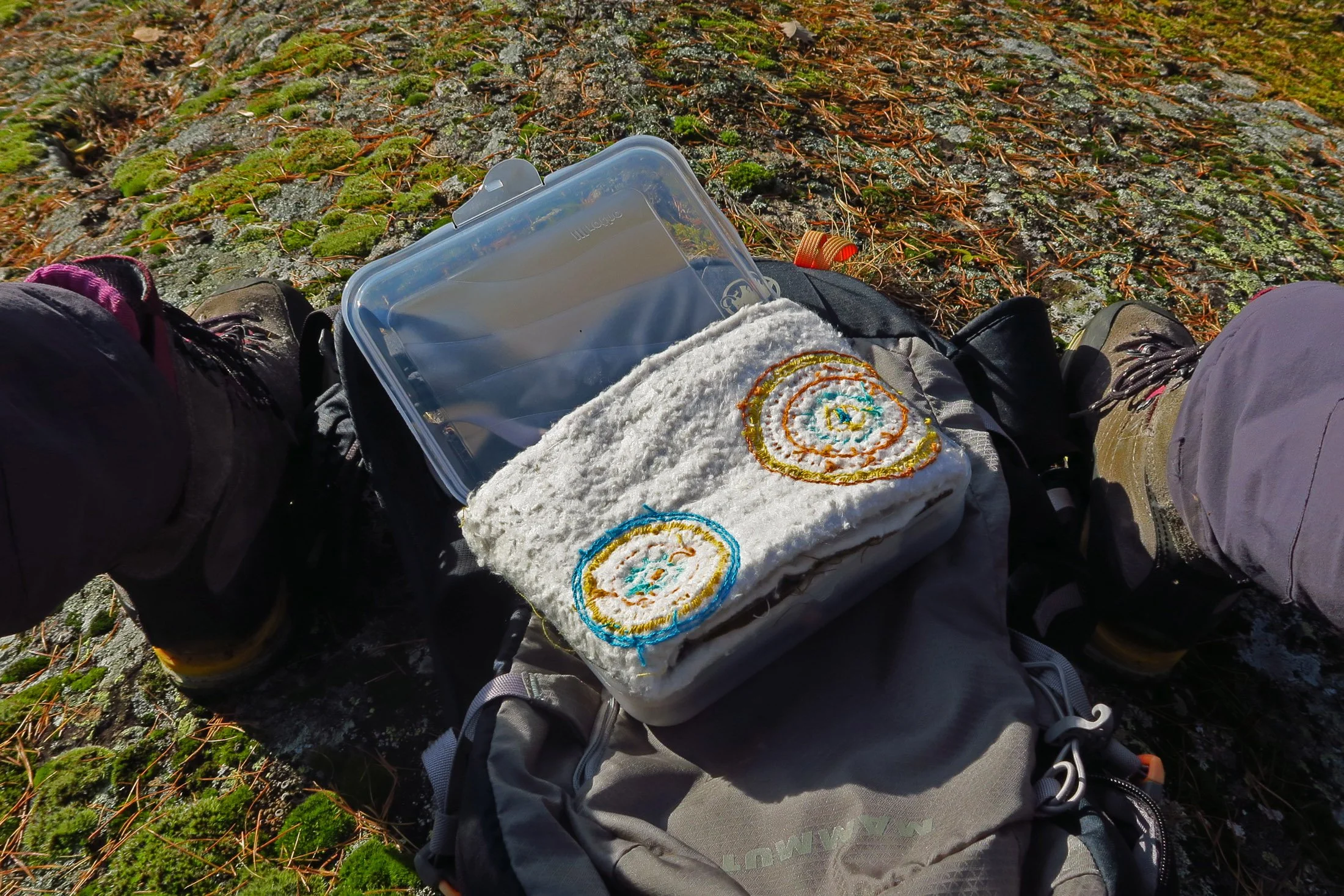 Ma petite boîte contenant ma broderie nomade m’a suivie quelquefois ces dernières semaines, mais plutôt dans le train ou en voiture. Là j’ai eu l’occasion de la remettre dans mon sac à dos et de m’installer pour broder dans la nature!