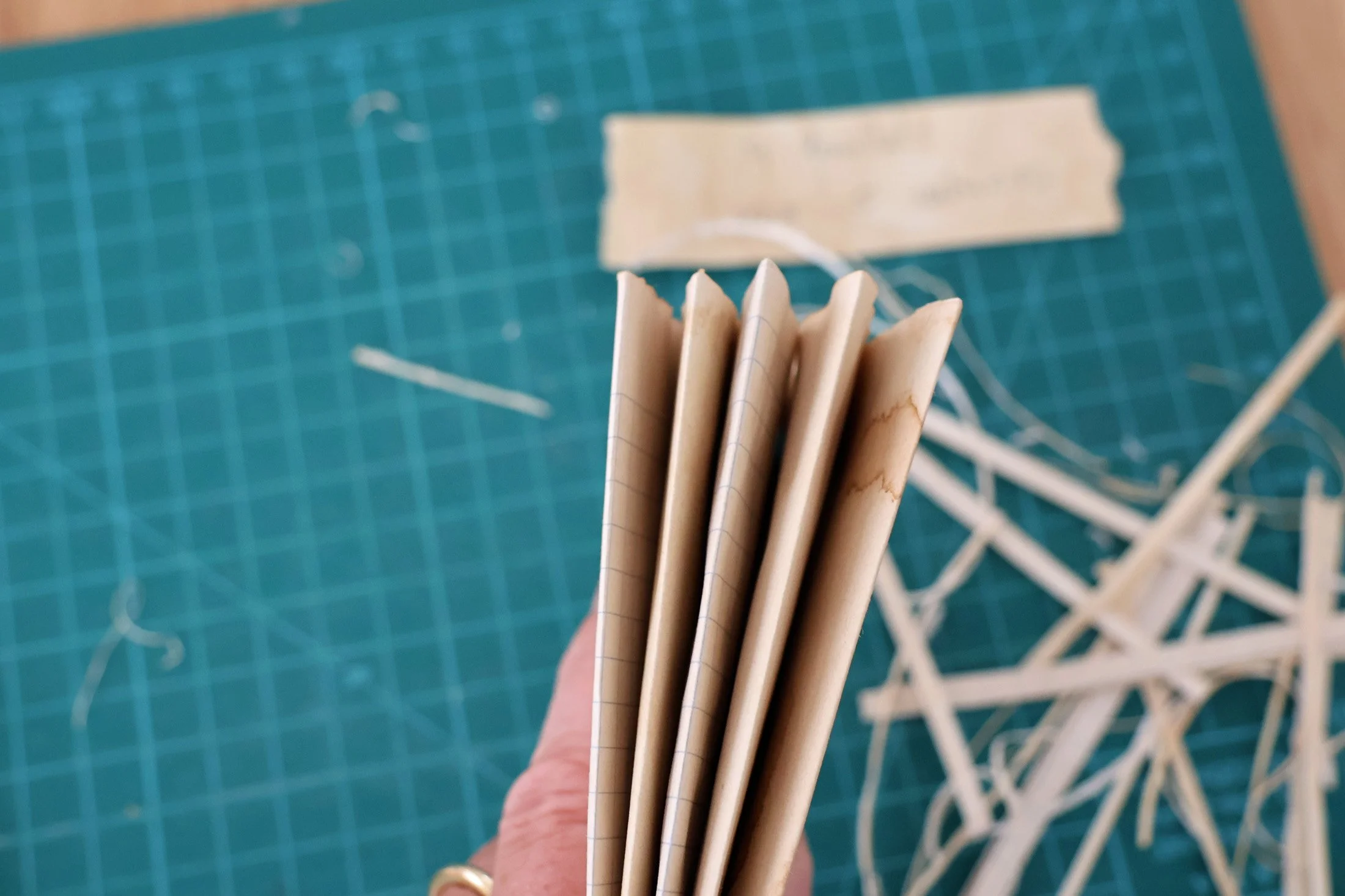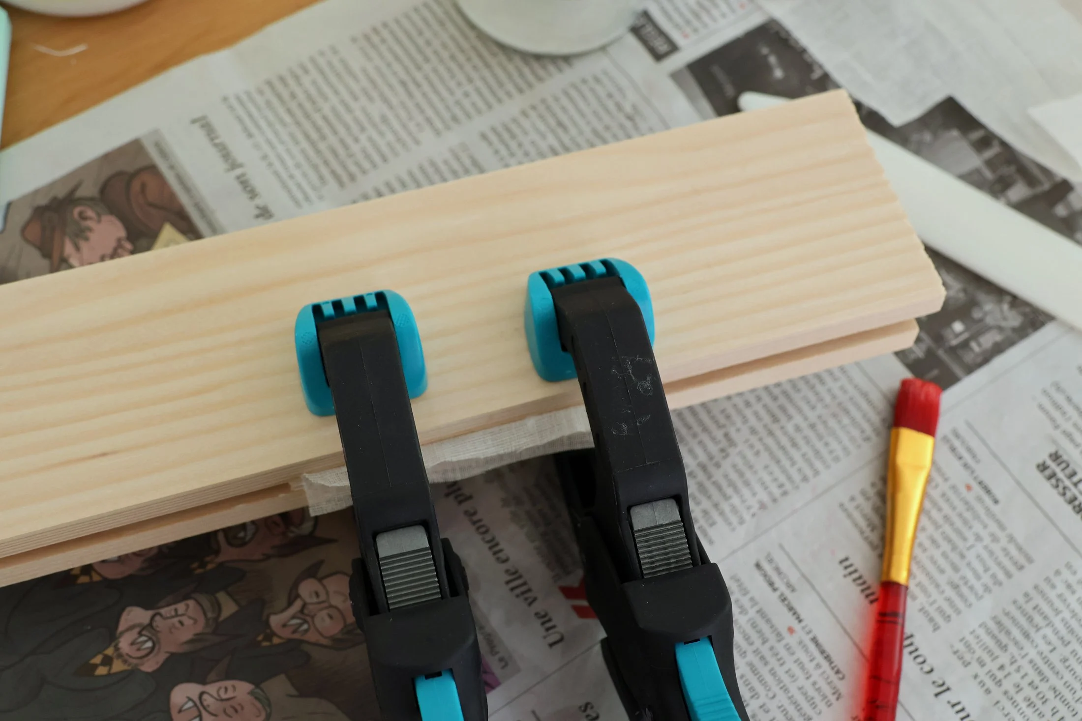 Encoller les cartons avec de la colle blanche étalée au pinceau. J’ai du petit matériel pour aider à bien les positionner.