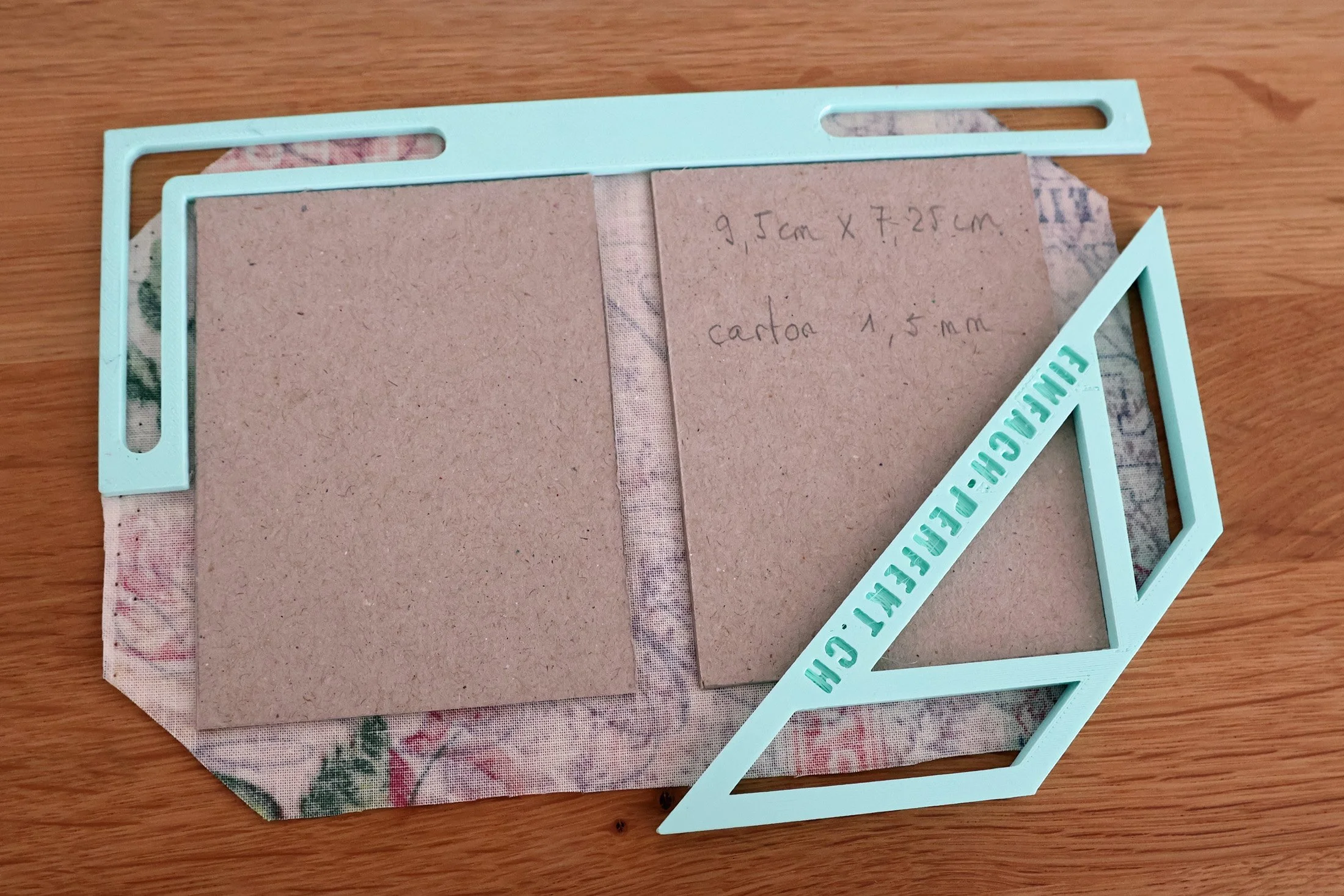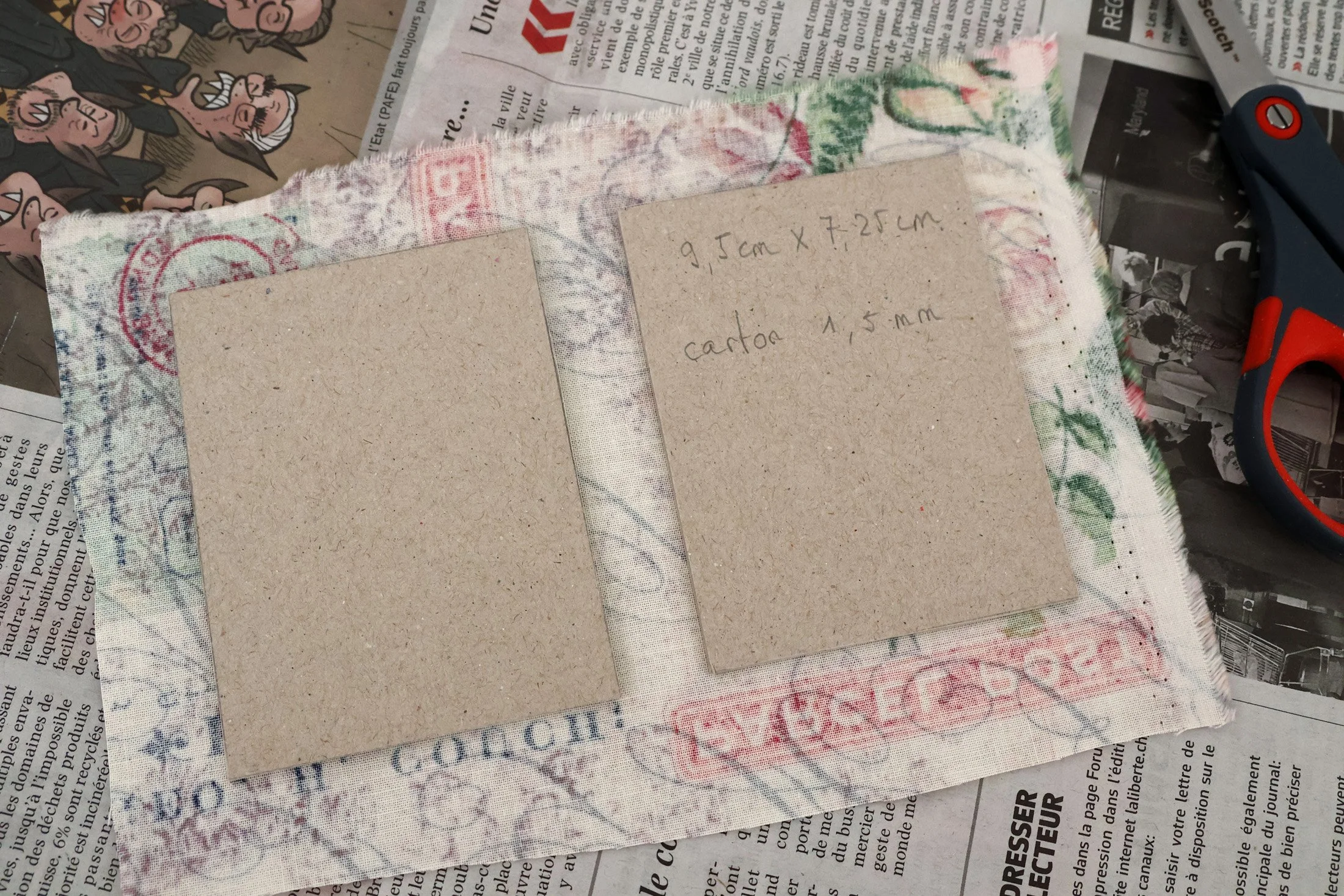 Pour commencer, je vous propose de réaliser la couverture. Découper 2 rectangles en carton épais et un morceau de tissu.