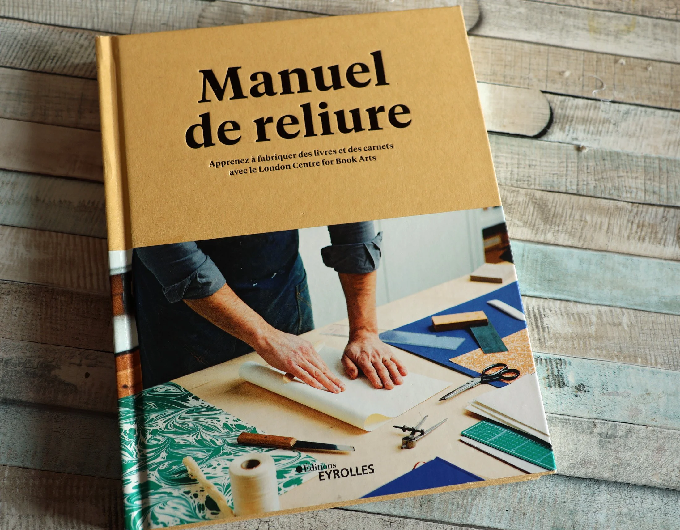 Le dos du corps (là où se trouvent les fils) est ensuite encollé. On peut y ajouter un morceau de toile pour solidifier et l’épaisseur est ensuite pressée entre 2 planches ou deux cartons épais. Je me suis fabriquée ce pressoir…