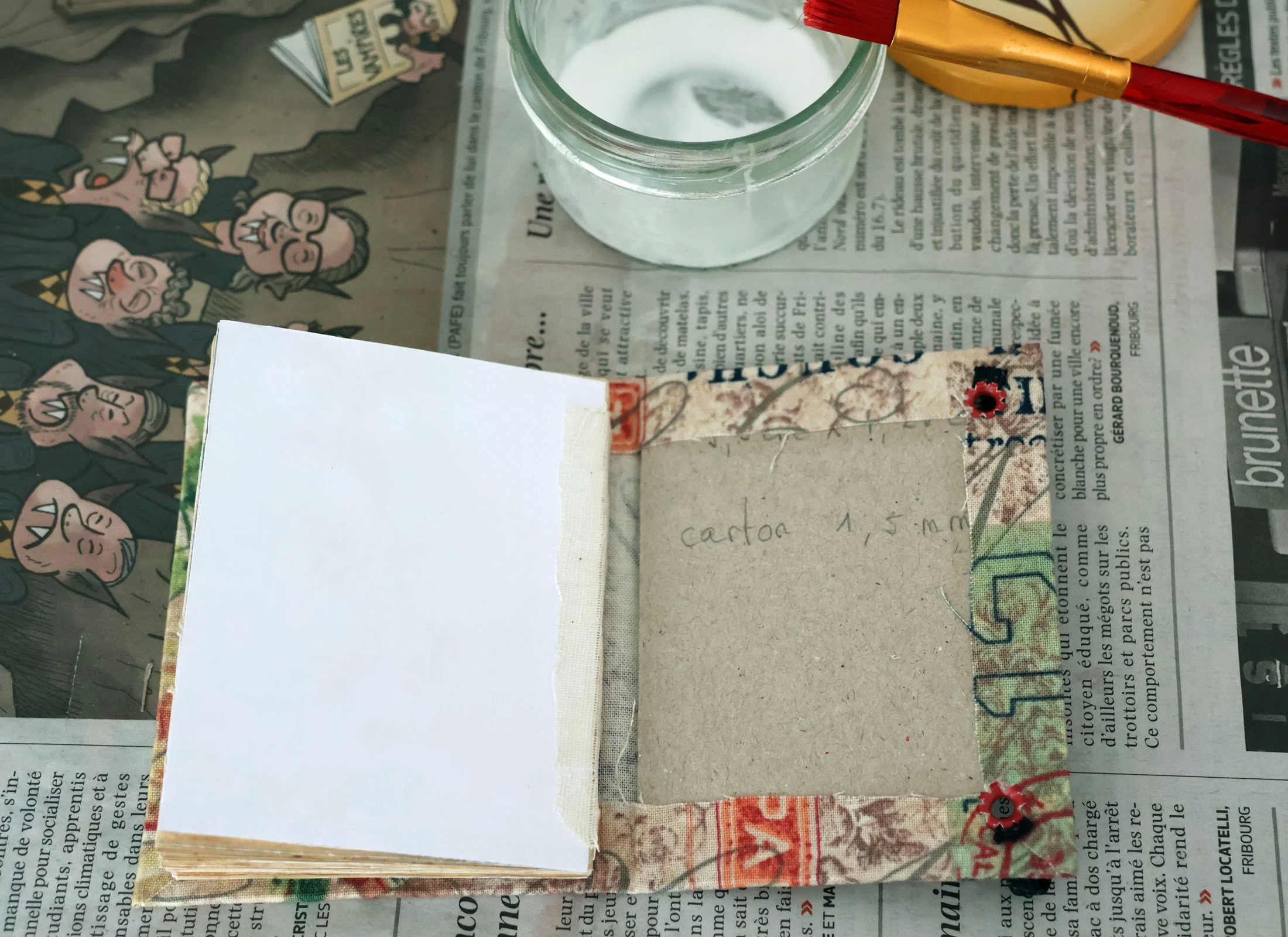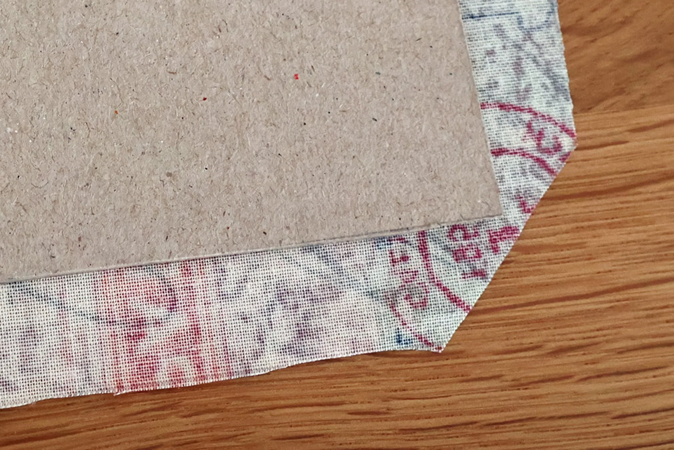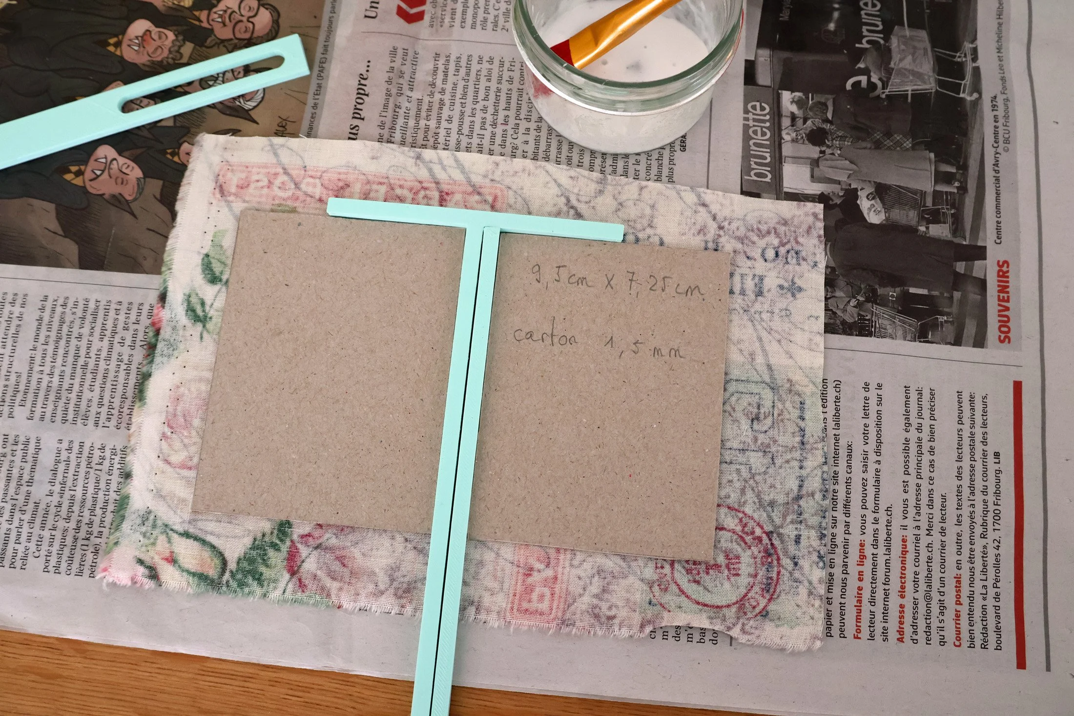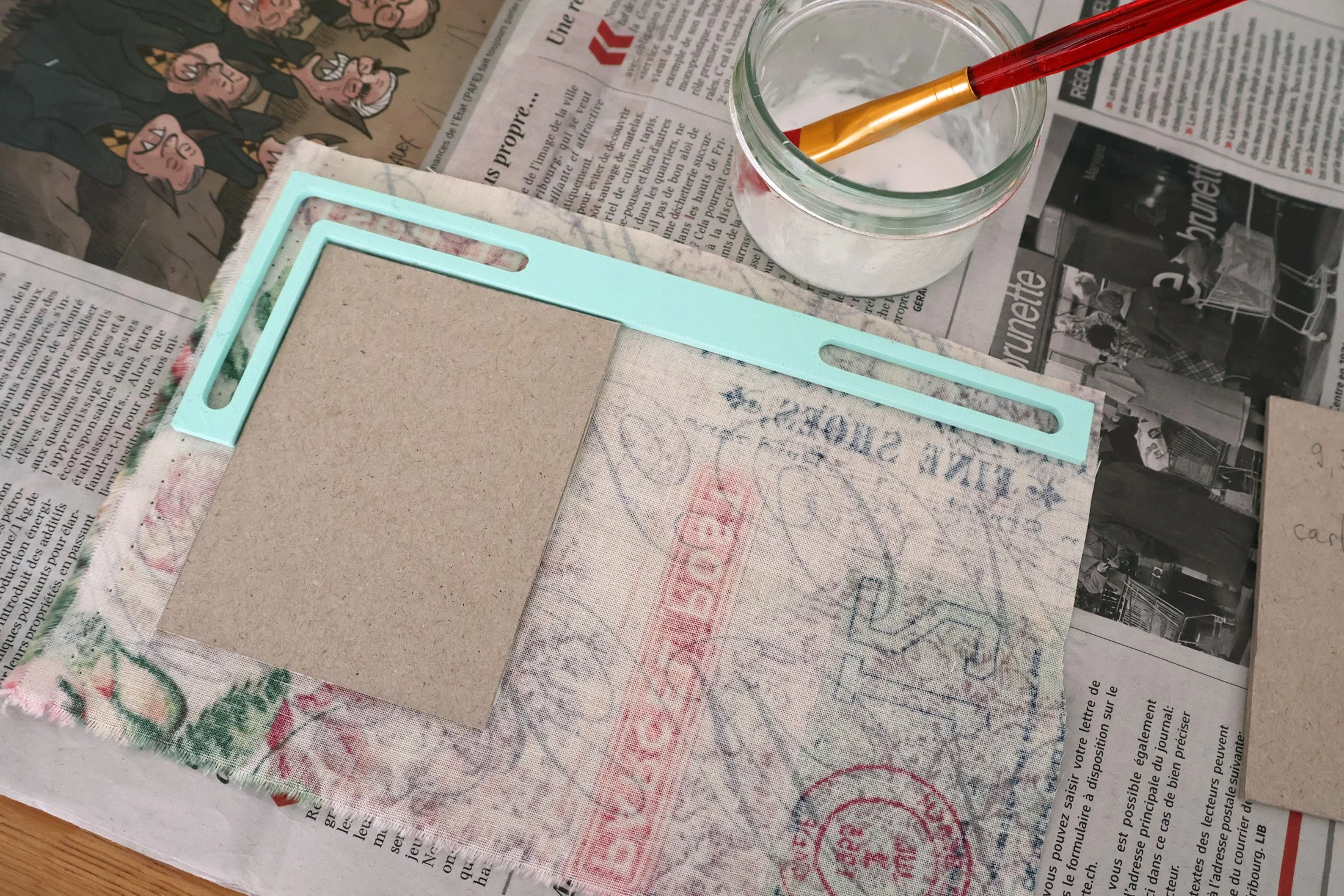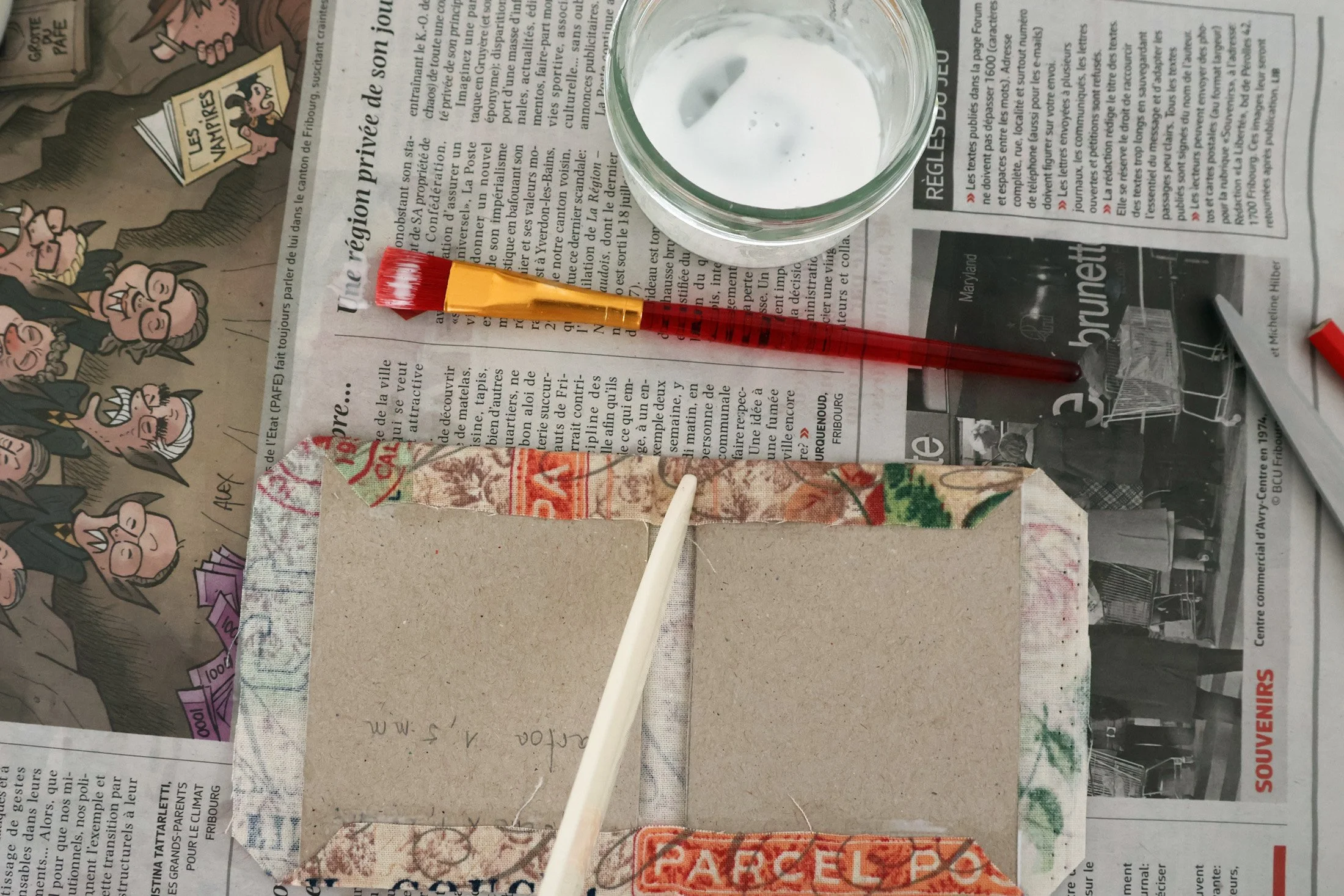 Rabattre les côtés, bien encoller les bords du cartons et le tissu au milieu.