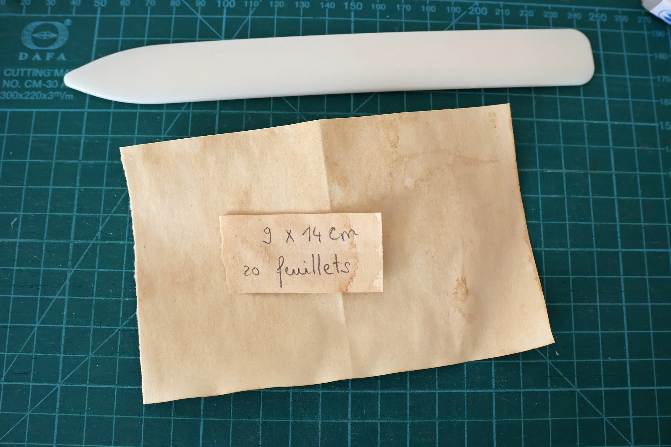 Voilà, la couverture est prête! On peut commencer avec les feuilles pour fabriquer le corps de l’ouvrage! J’ai utilisé ici des feuilles teintes au café, mais n’importe quelle feuille (environ 90-100g/m2) convient. Le plioir est très utile pour bien aplatir les plis.