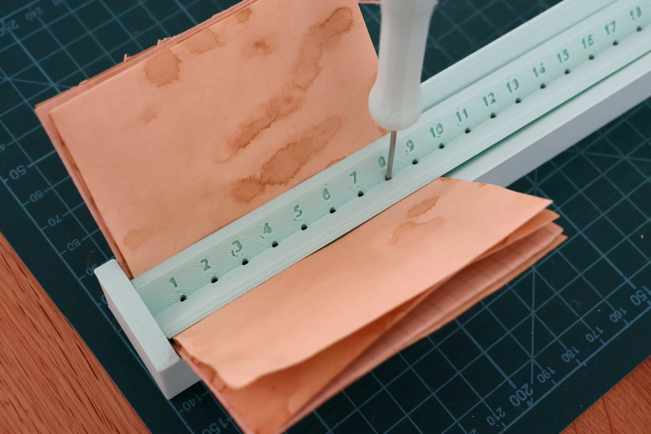 Ensuite, il s’agit de percer chaque cahier dans le pli. Le bidule plastique n’est pas nécessaire, par contre un poinçon est très utile.