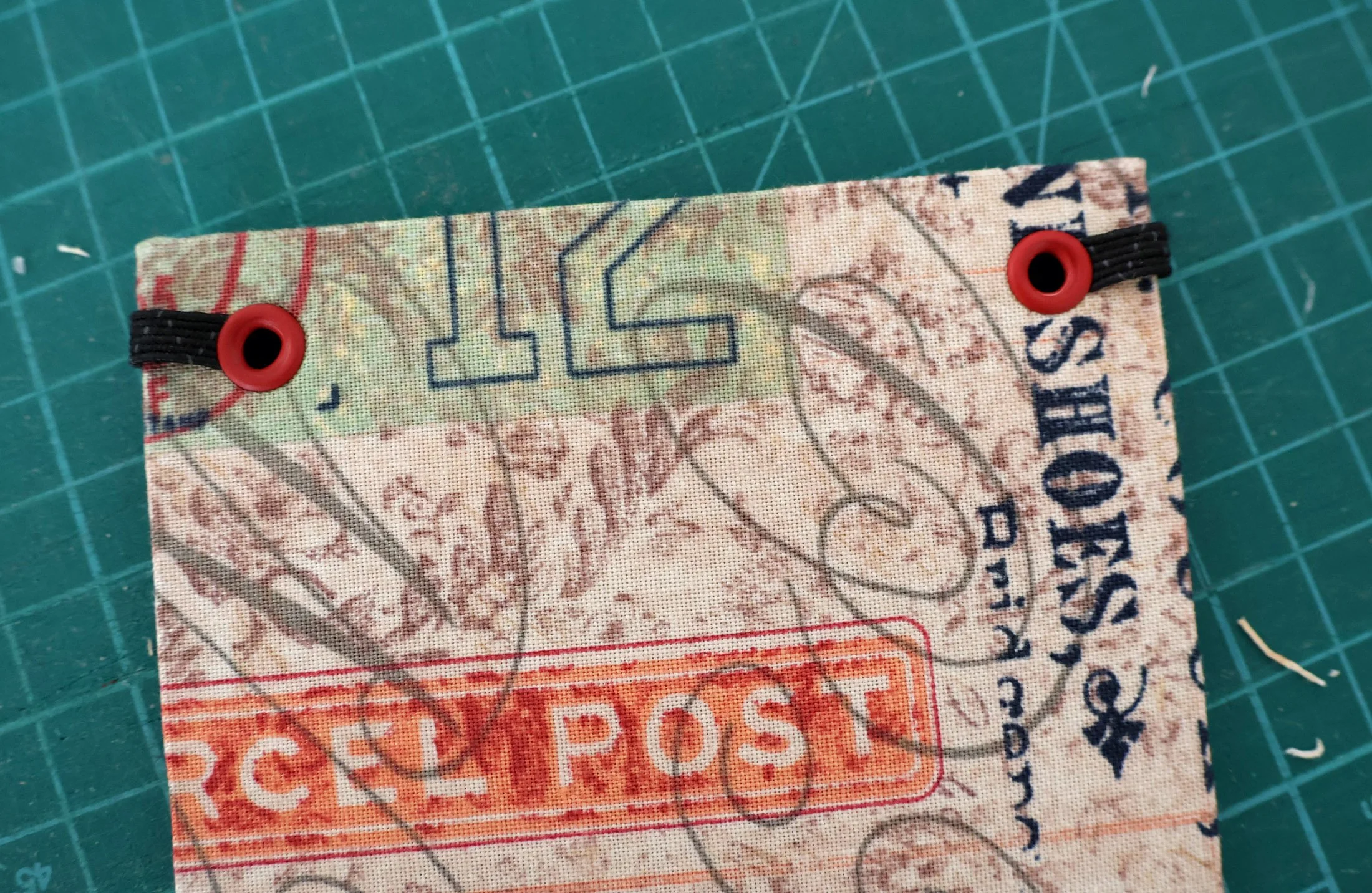 J’ai utilisé des œillets, mais ça va aussi en faisant des incisions pour enfiler l’élastique.