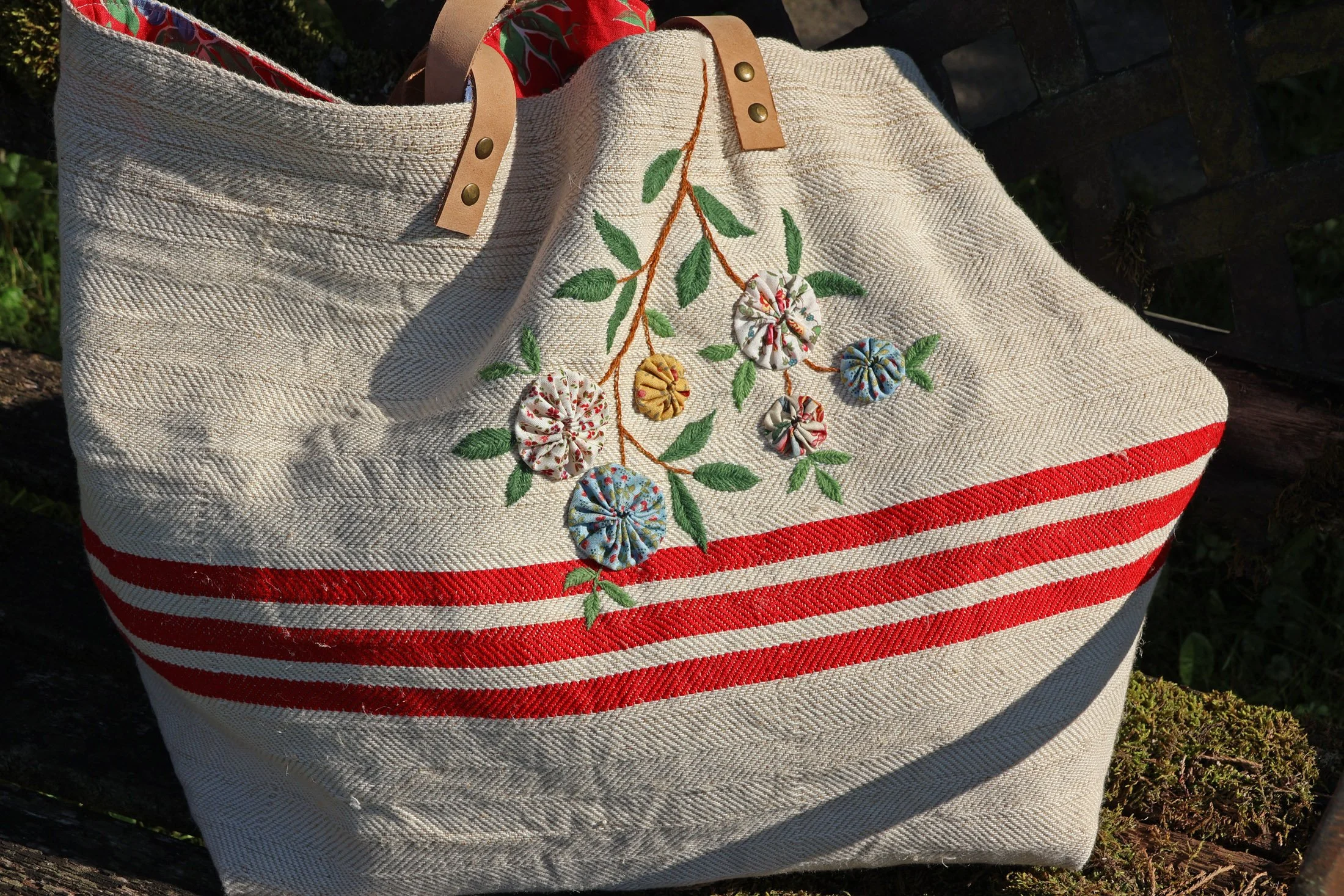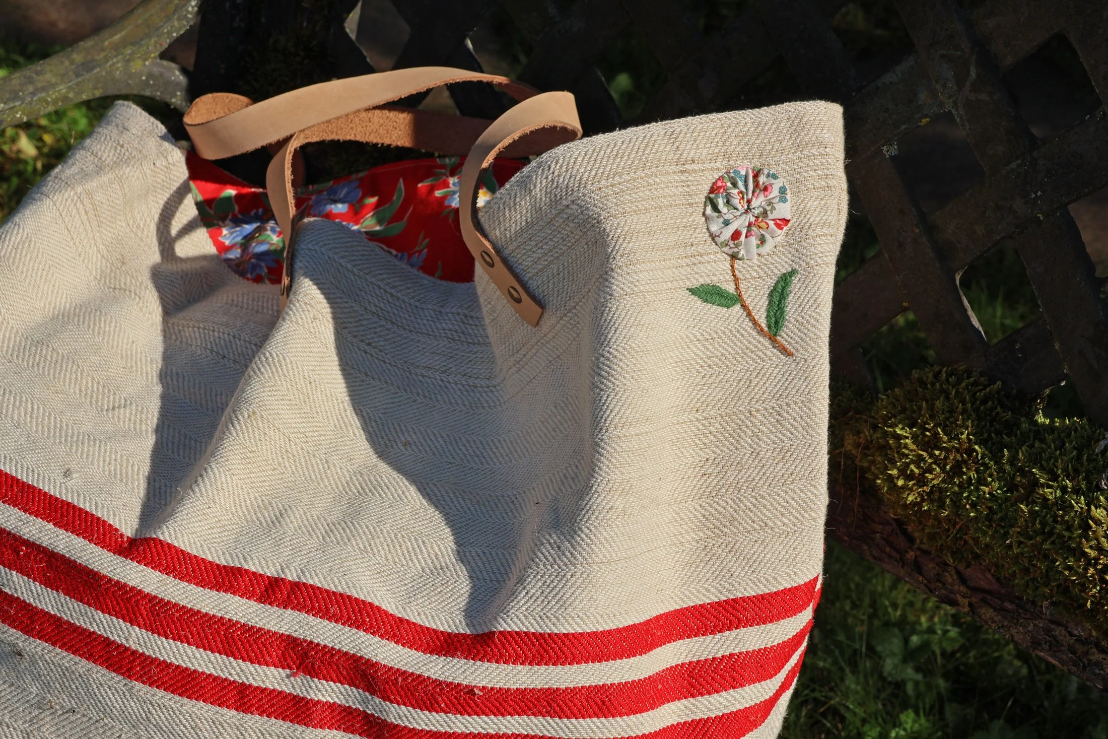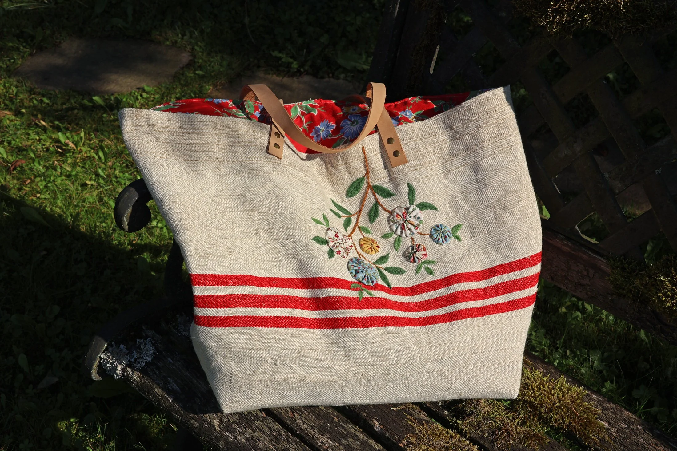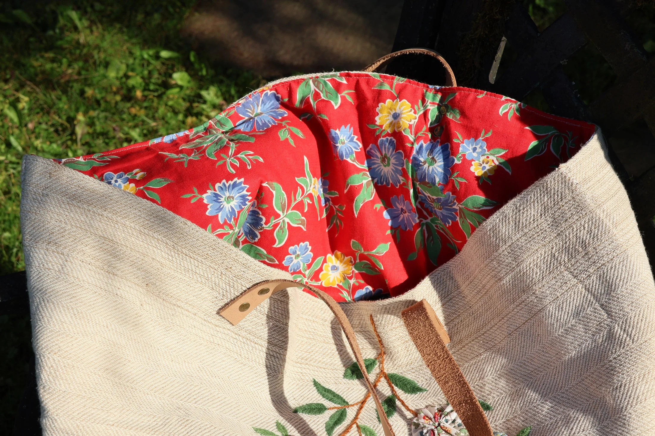 Chez ma copine Jo qui tient, avec son mari, un stand de brocante au Col des Mosses, en été, j’ai eu la chance de me procurer un magnifique sac à grains. Je voulais d’abord le transformer en chemin de table, mais finalement j’ai craqué dans la réalisation d’un grand sac!