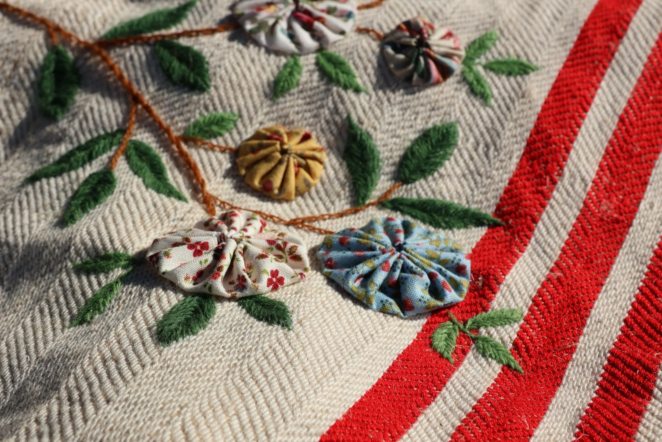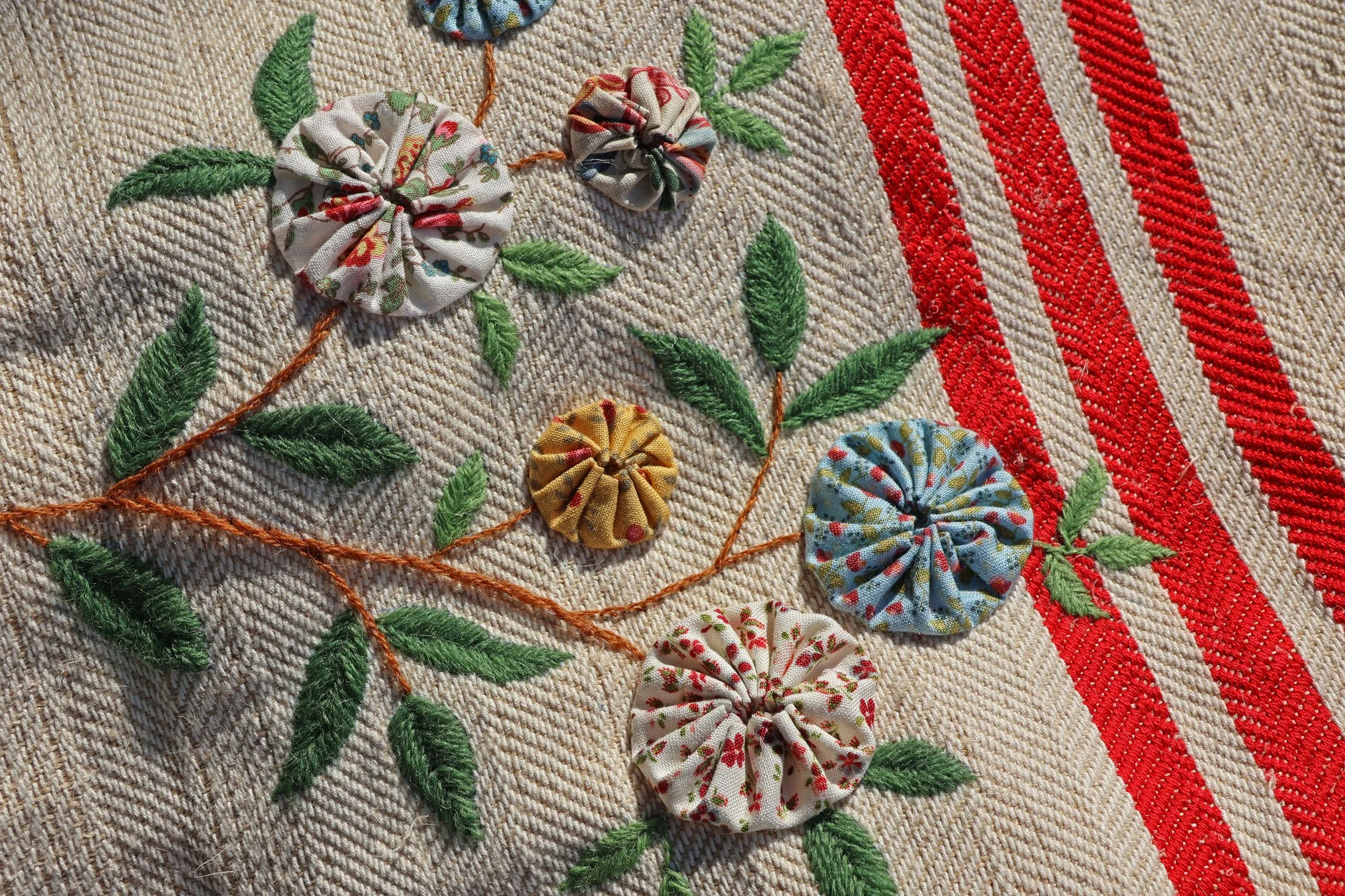 Cette toile est splendide, elle se suffit à elle-même, et je voulais l’embellir de façon assez “légère”. Quelques branches brodées, agrémentées de fleurs en yo-yo, c’était juste ce qu’il fallait!