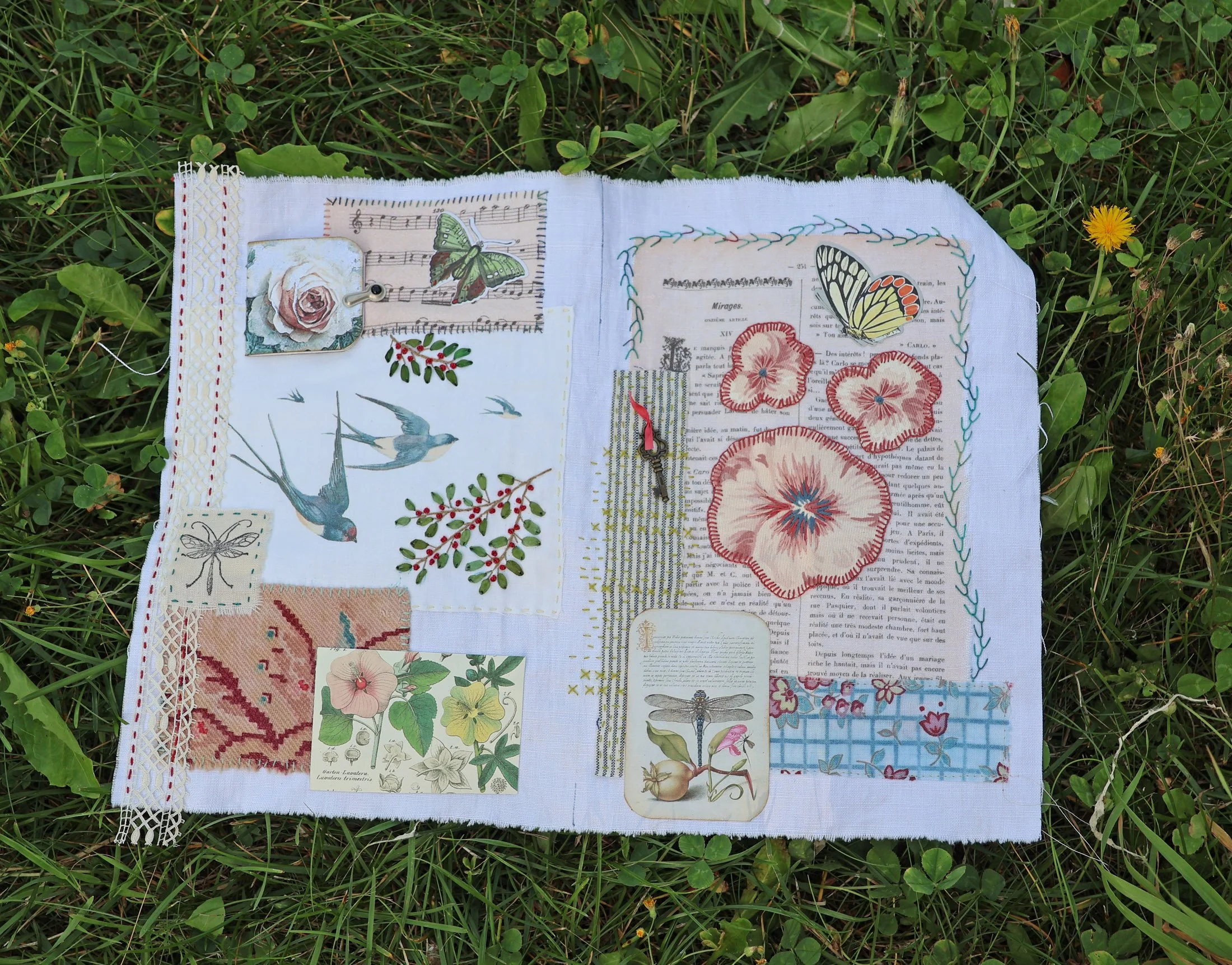 Une place à la libellule, fil rouge de ce carnet textile. Elle a ici vraiment toute sa place, car nous avons eu les premières visites de demoiselles et libellules dans notre jeune étang du jardin au début de l’été.