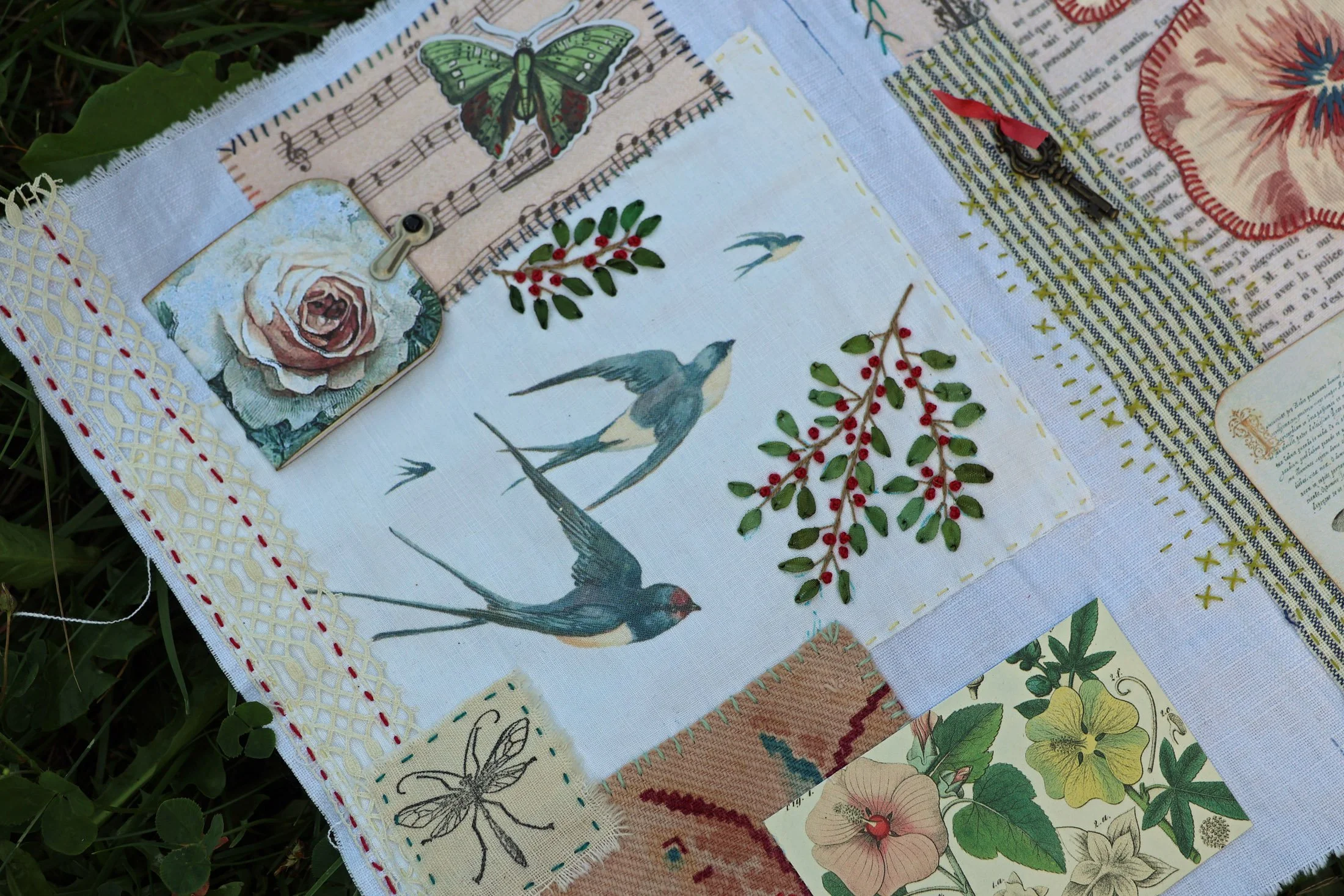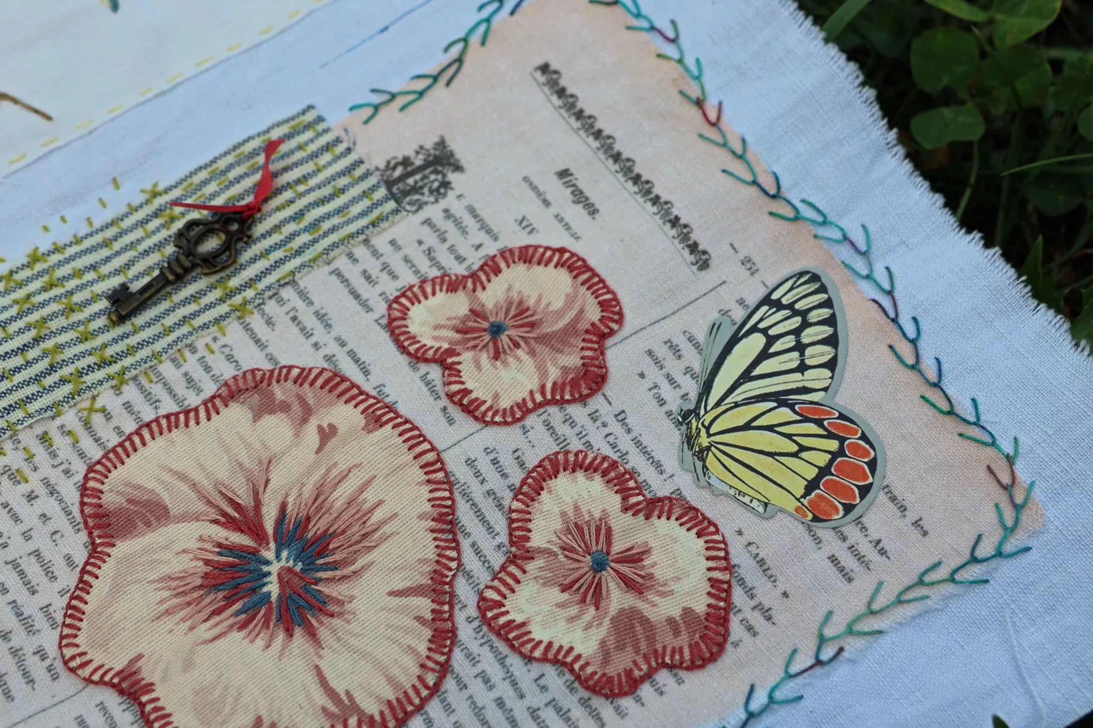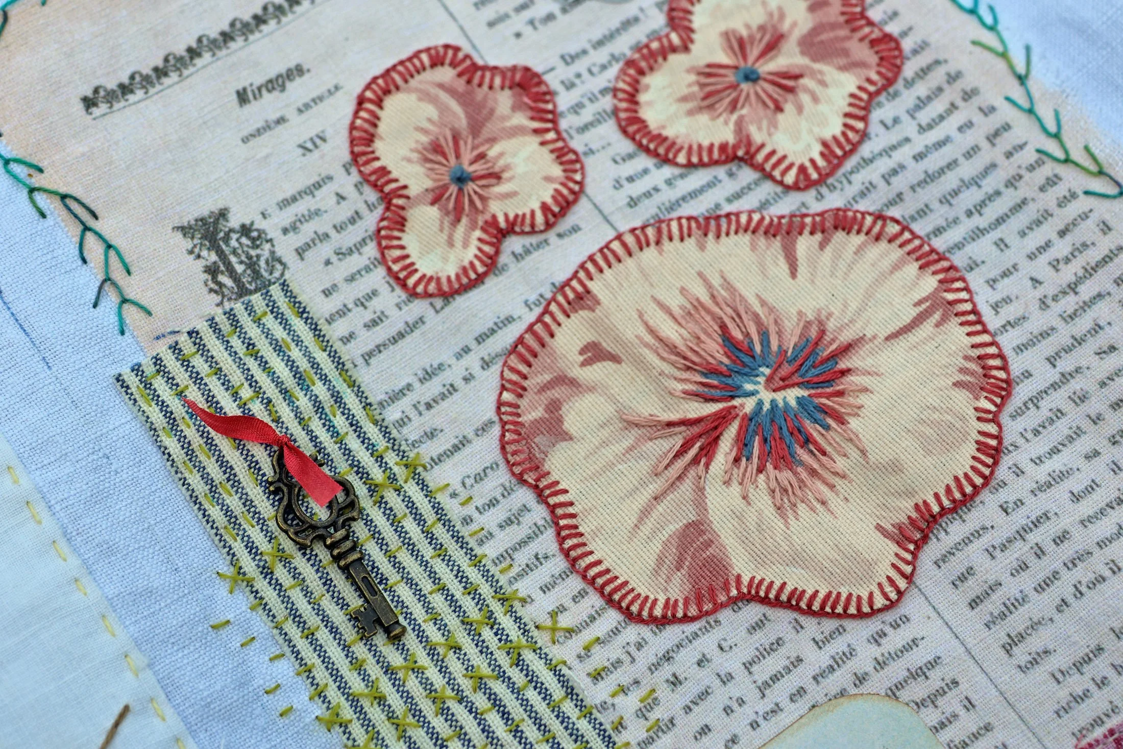 Une page de livre ancien également imprimée , agrémentée de fleurs rebrodées