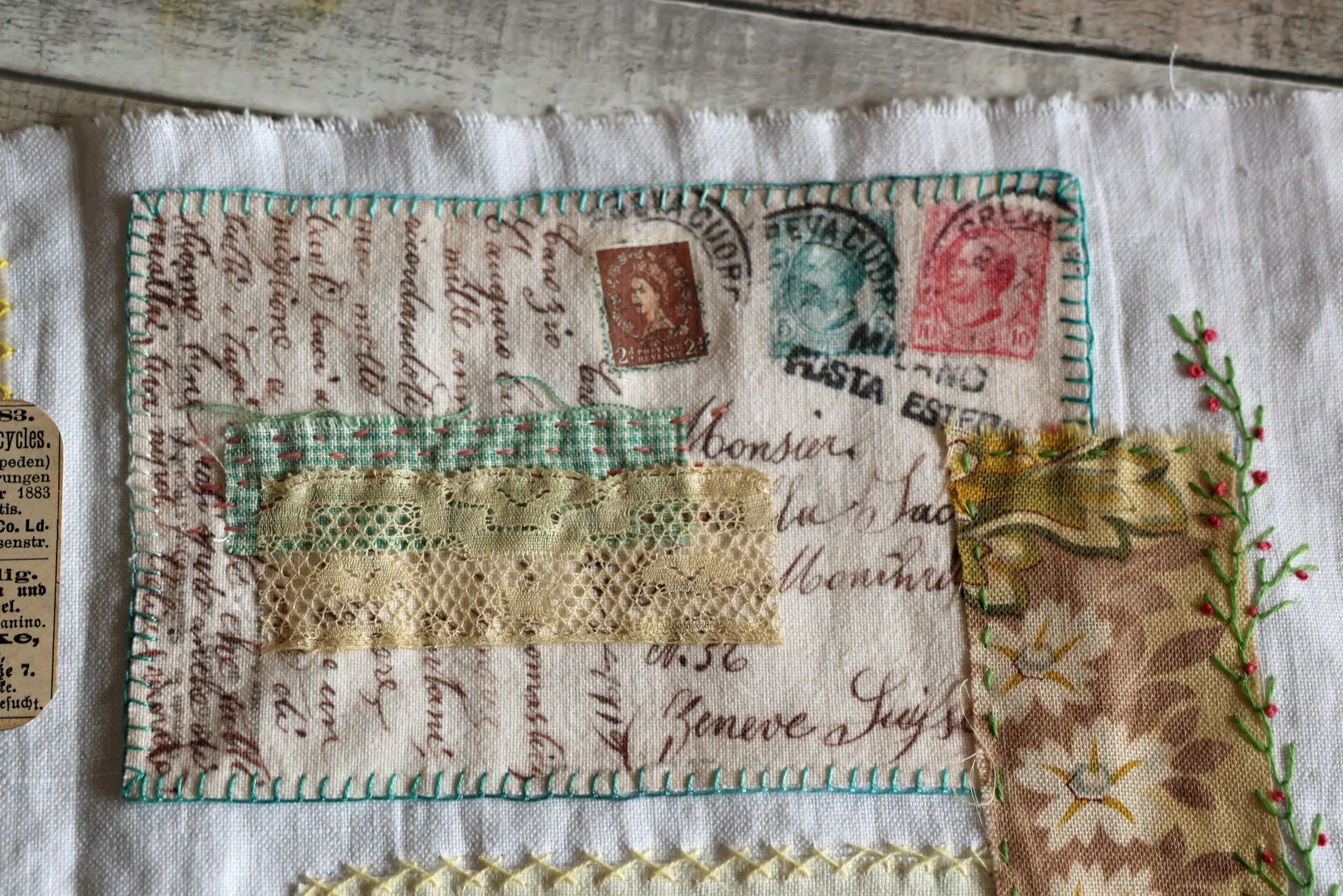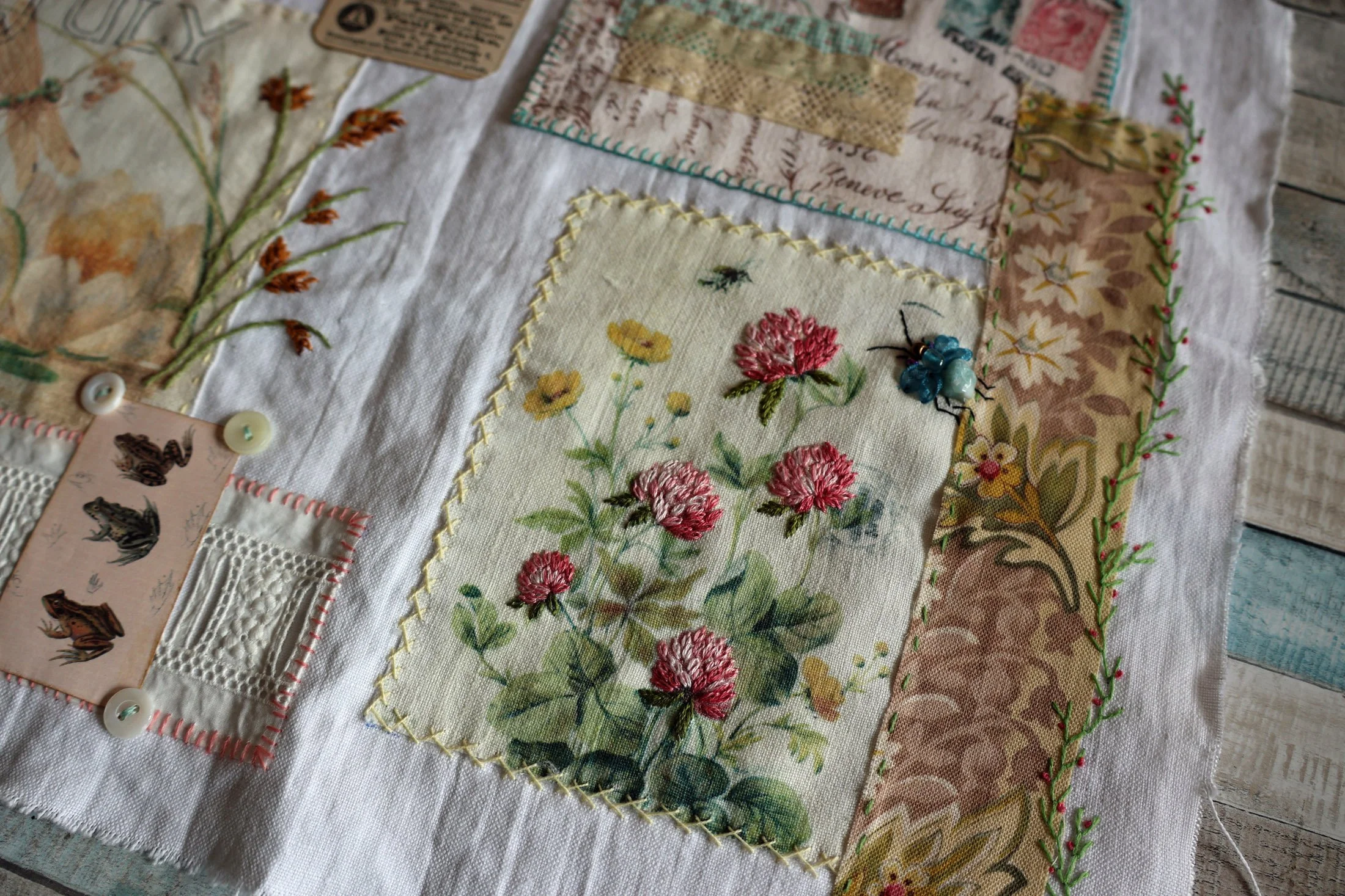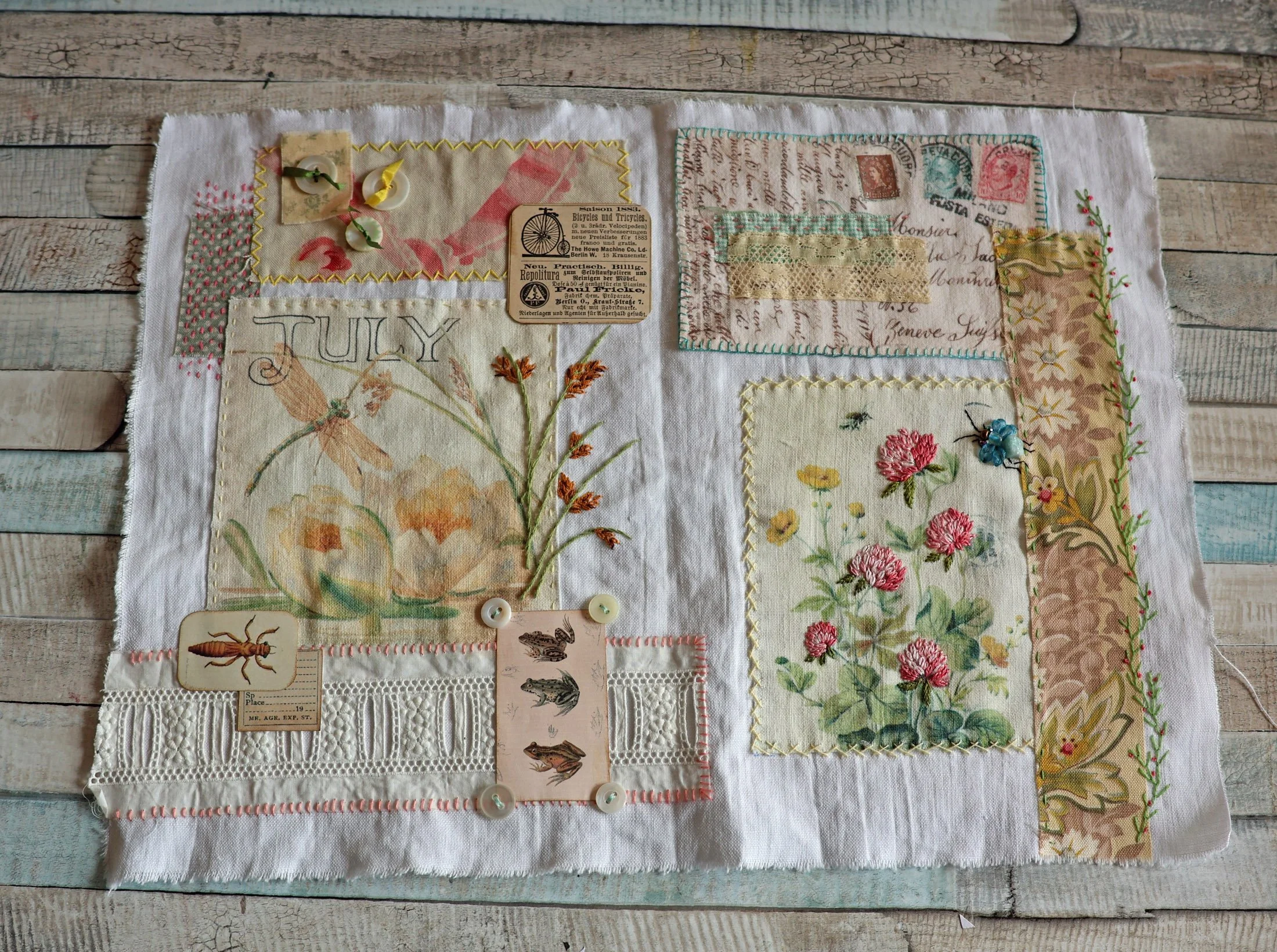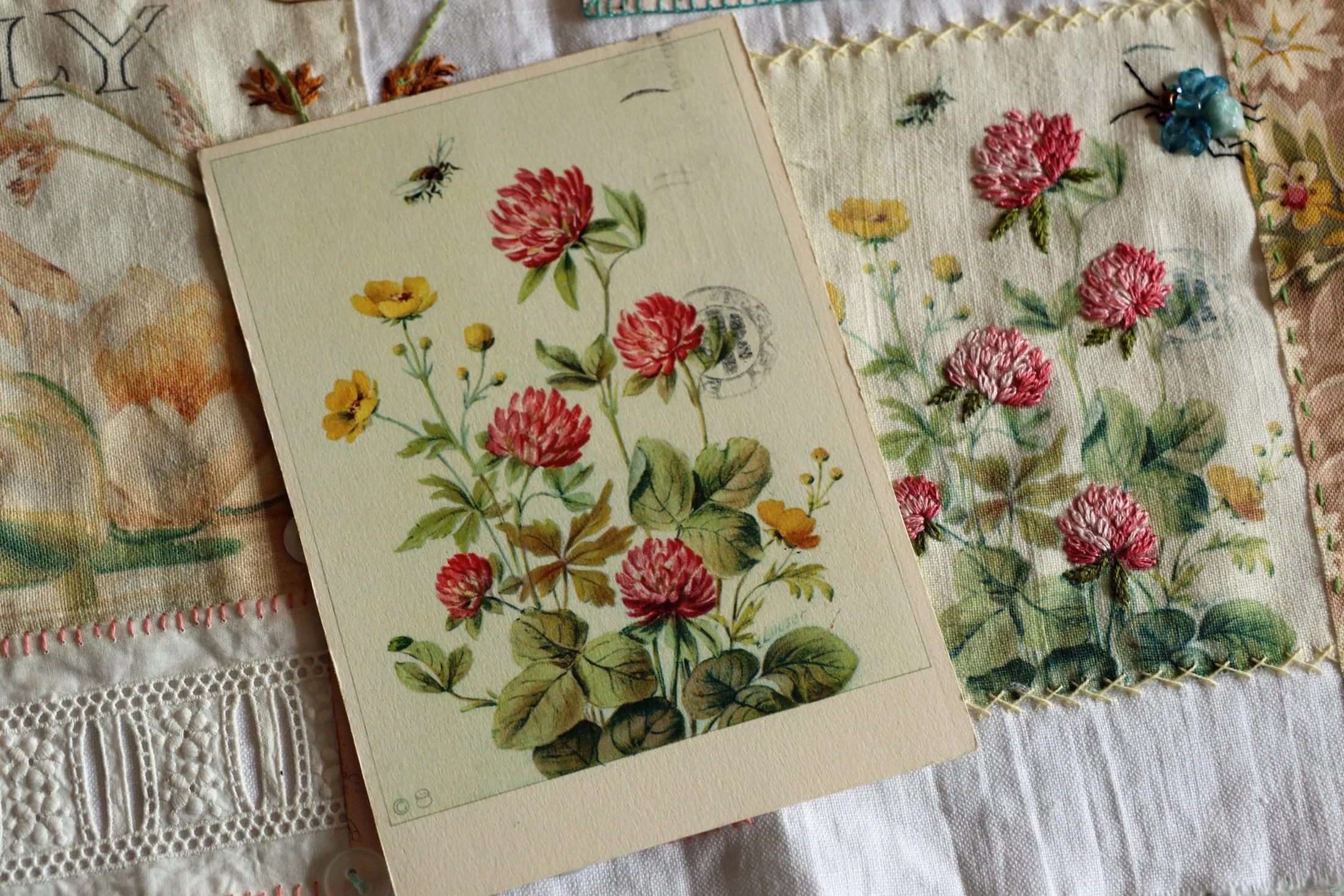 Comme l’été est la période des vacances, des cartes postales ont aussi pris place sur la page. J’ai choisi ce joli bouquet de trèfles et renoncules, imprimé sur du drap…