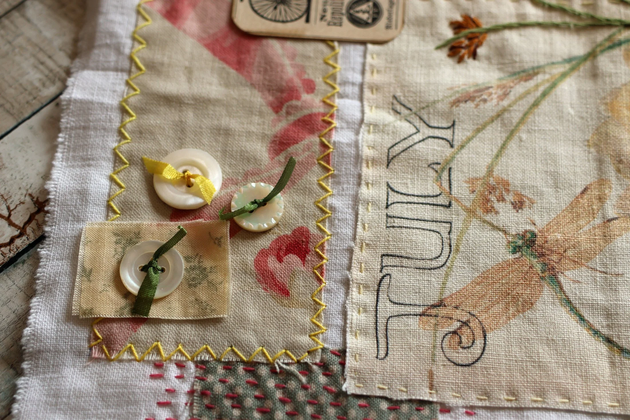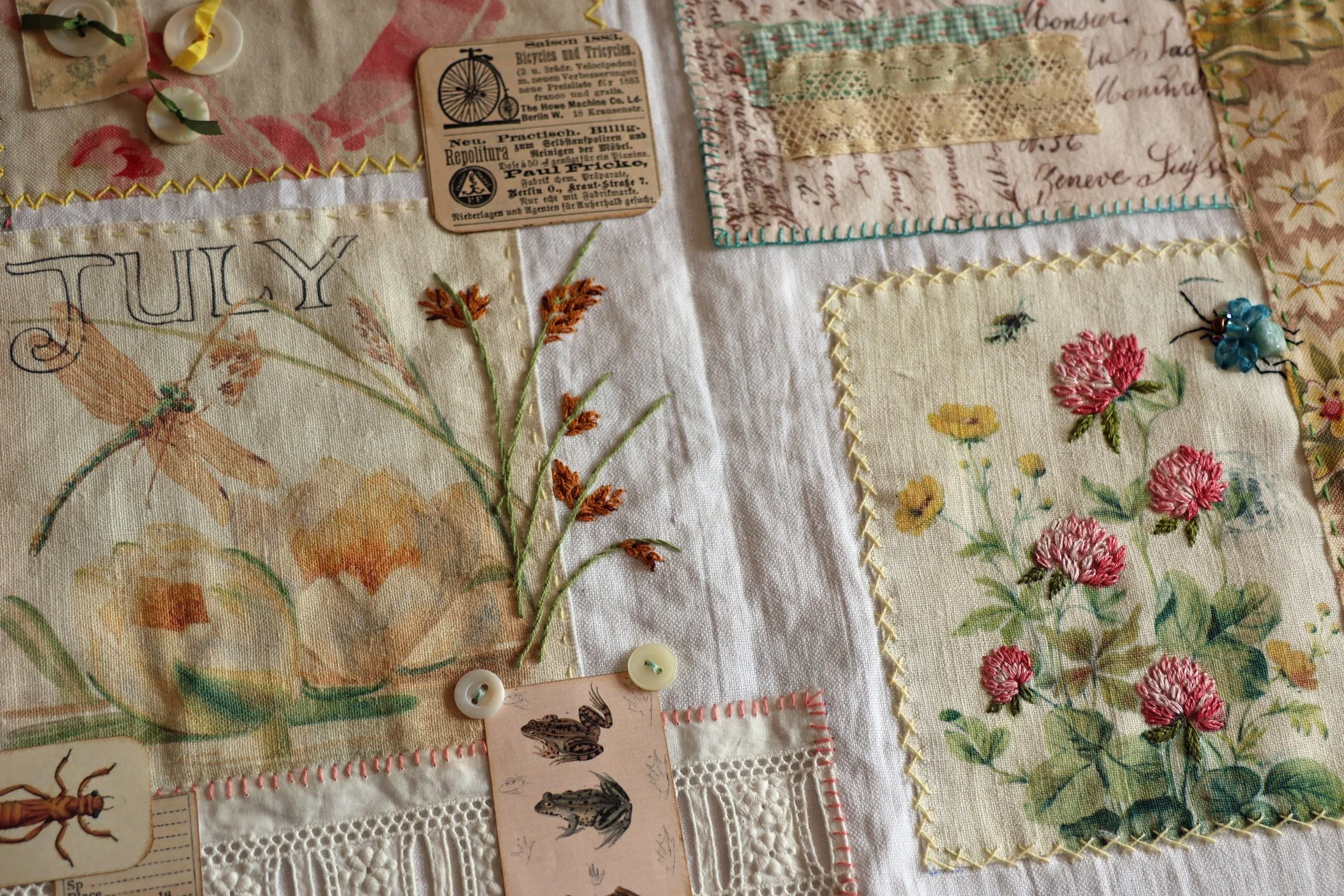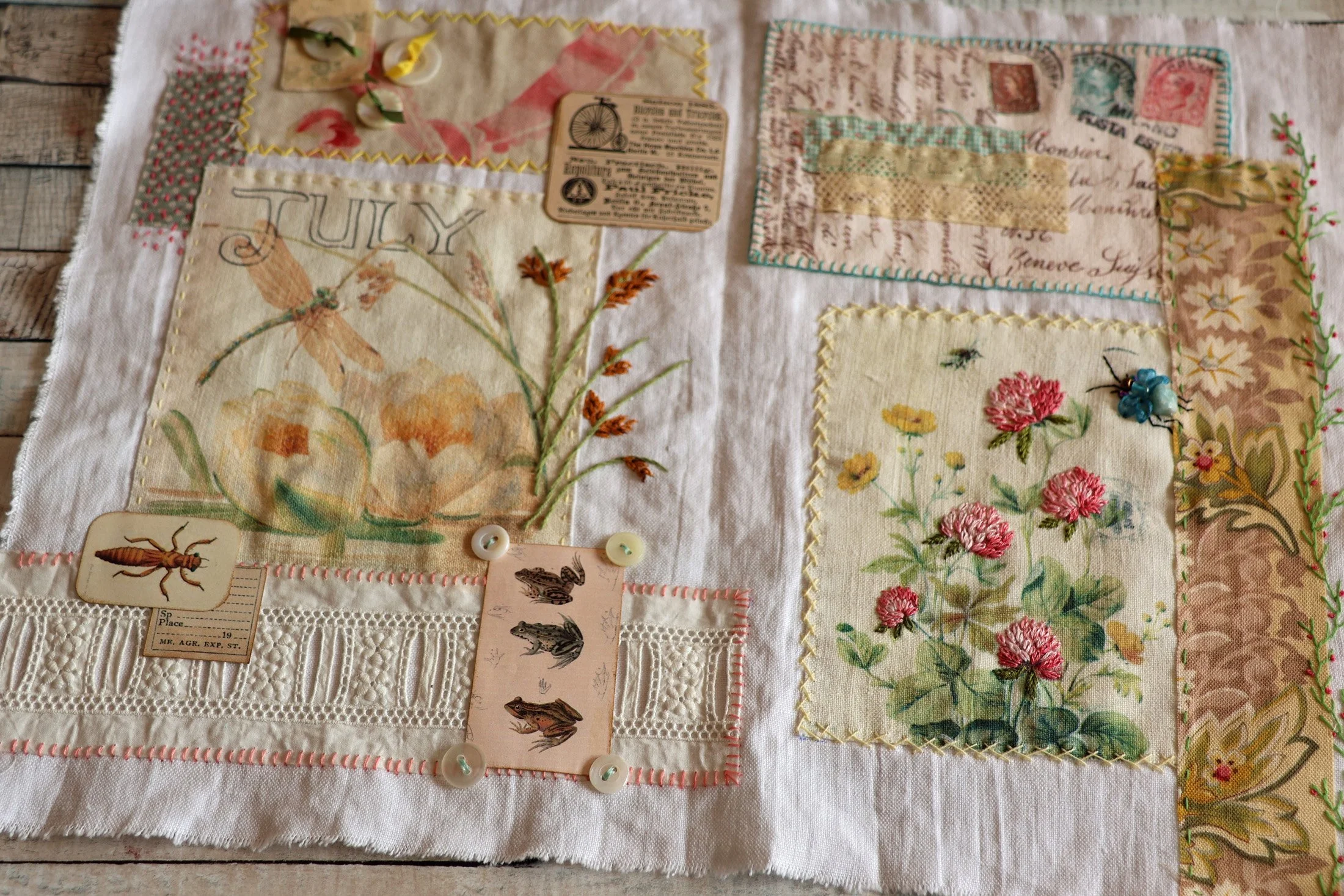 Comme l’été est la période des vacances, des cartes postales ont aussi pris place sur la page. J’ai choisi ce joli bouquet de trèfles et renoncules, imprimé sur du drap…