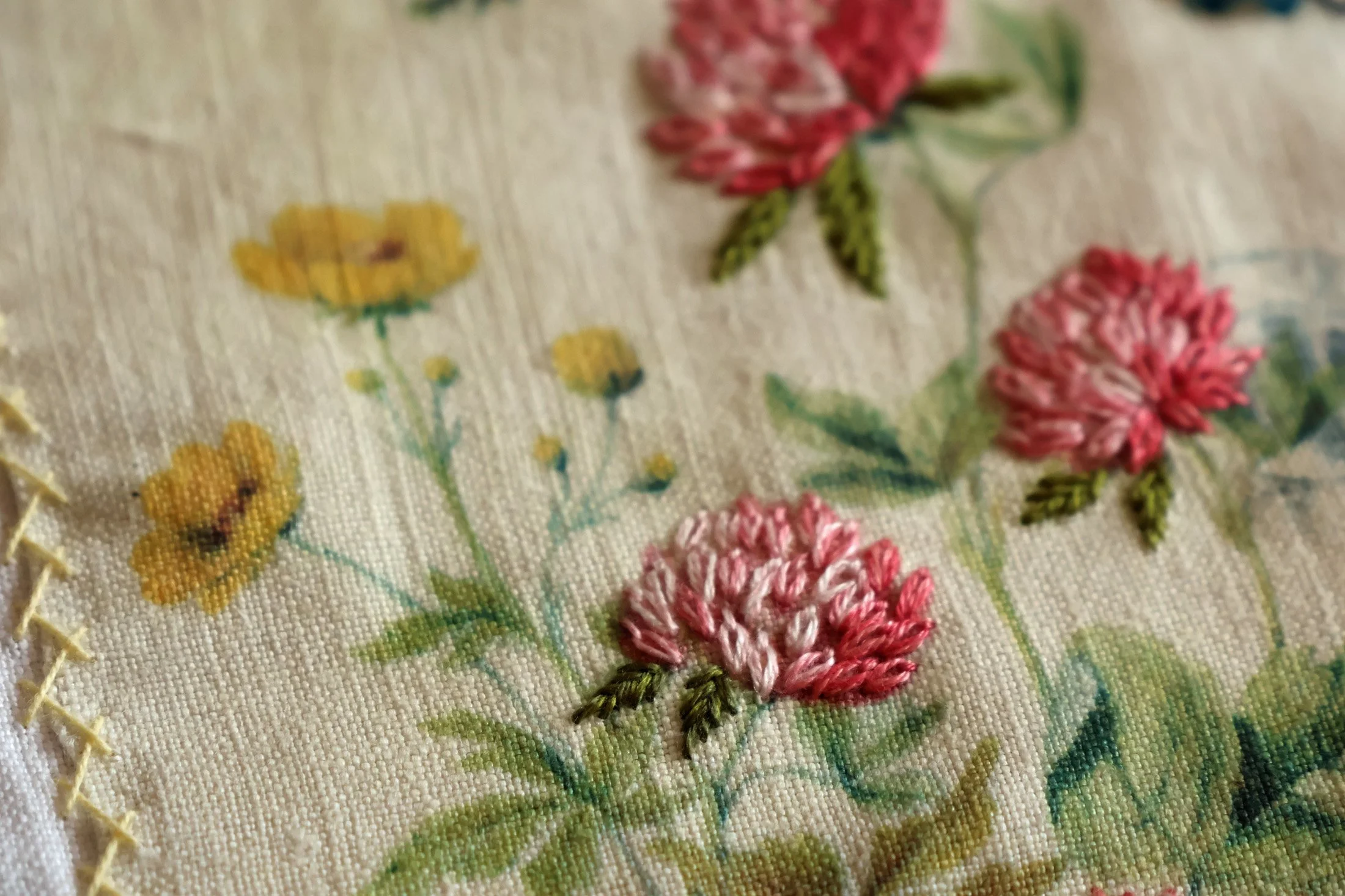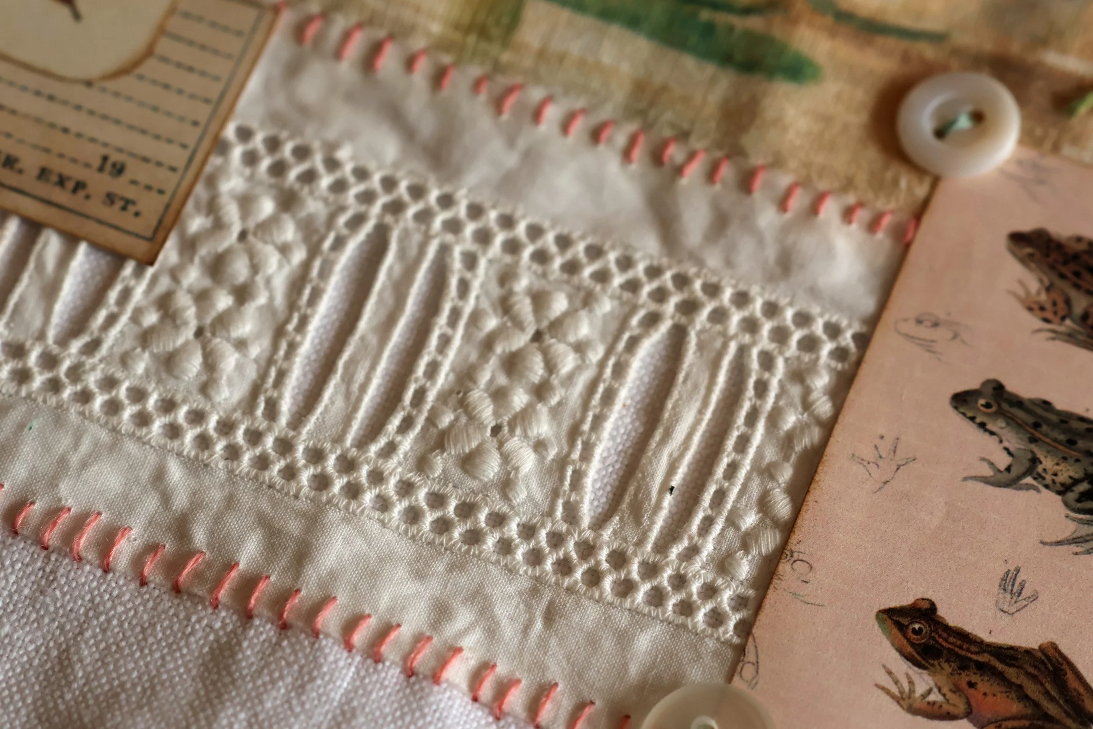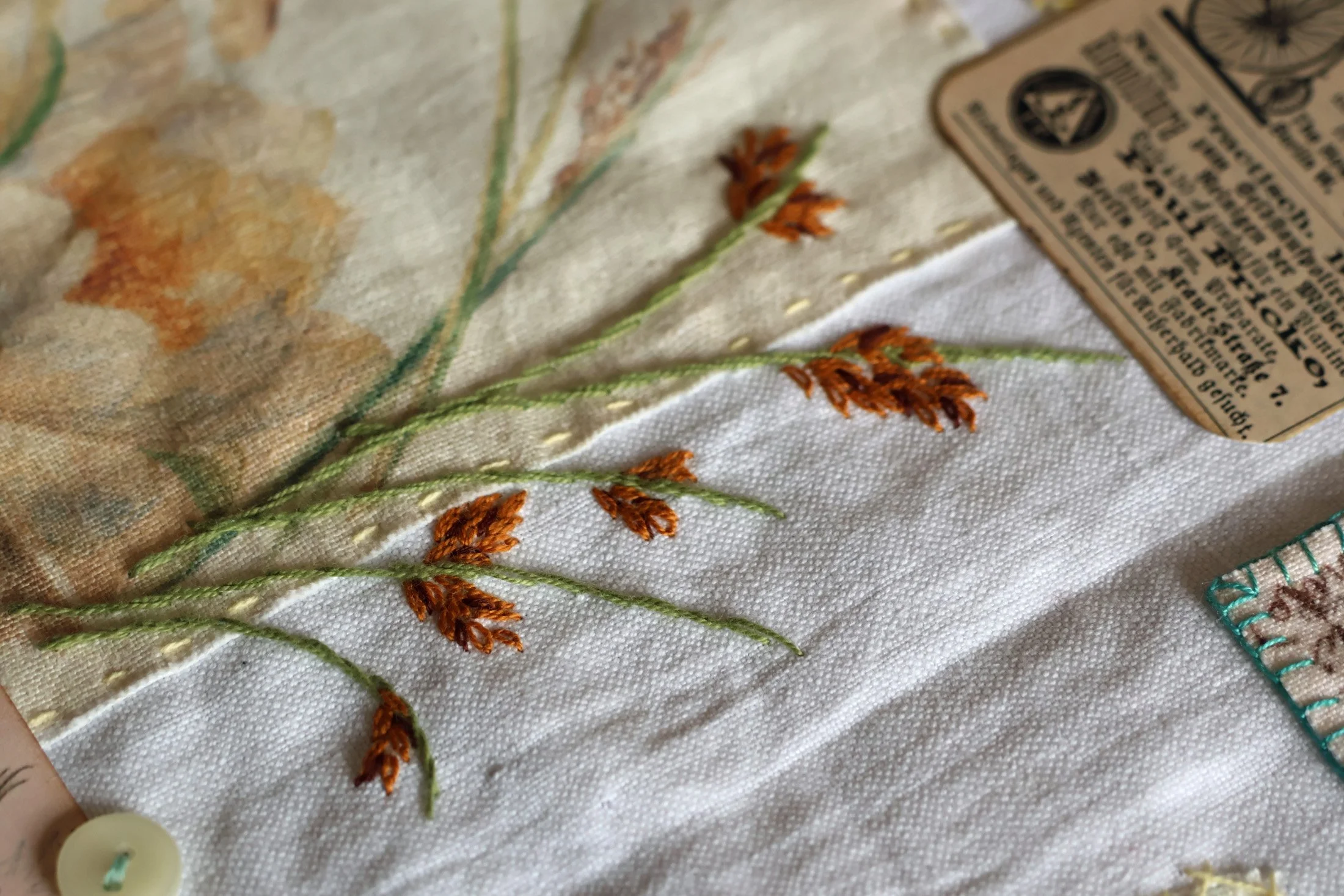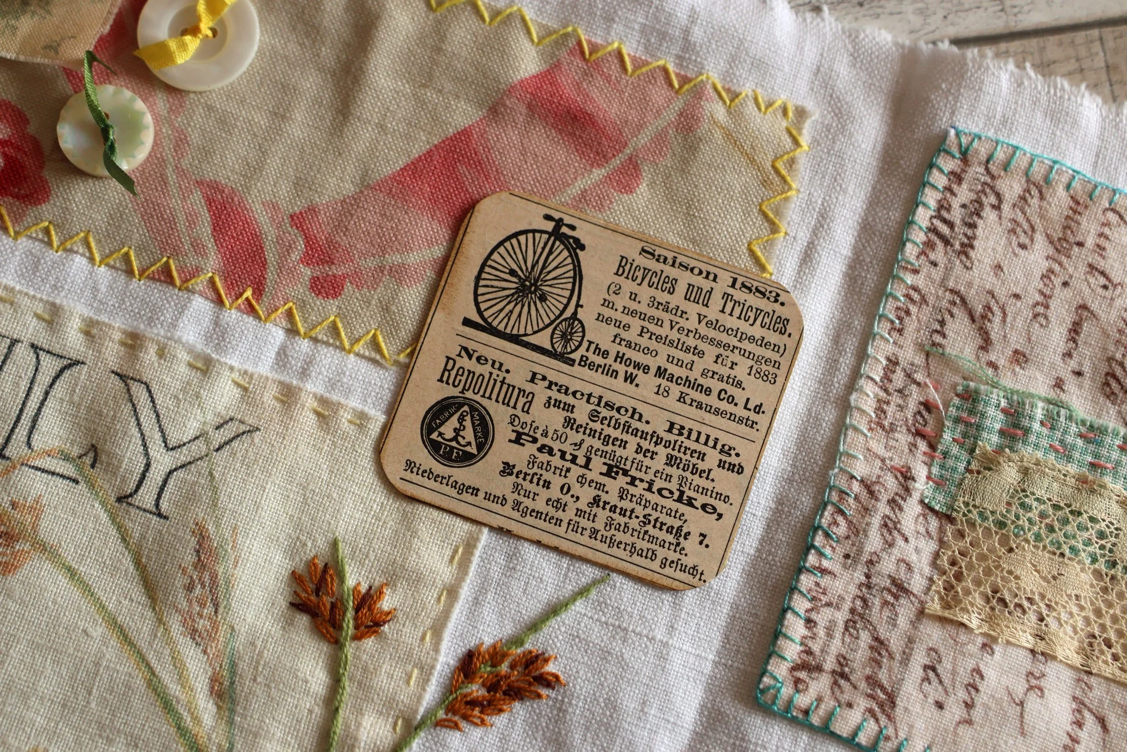 Comme l’été est la période des vacances, des cartes postales ont aussi pris place sur la page. J’ai choisi ce joli bouquet de trèfles et renoncules, imprimé sur du drap…