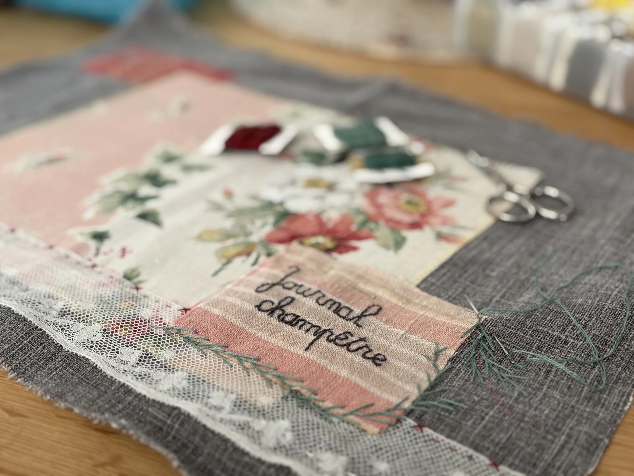 Et tout autour, j’ai joué avec les bouts de tissus, dentelles et vieux papiers ainsi que des ornements en broderie ou yoyos.