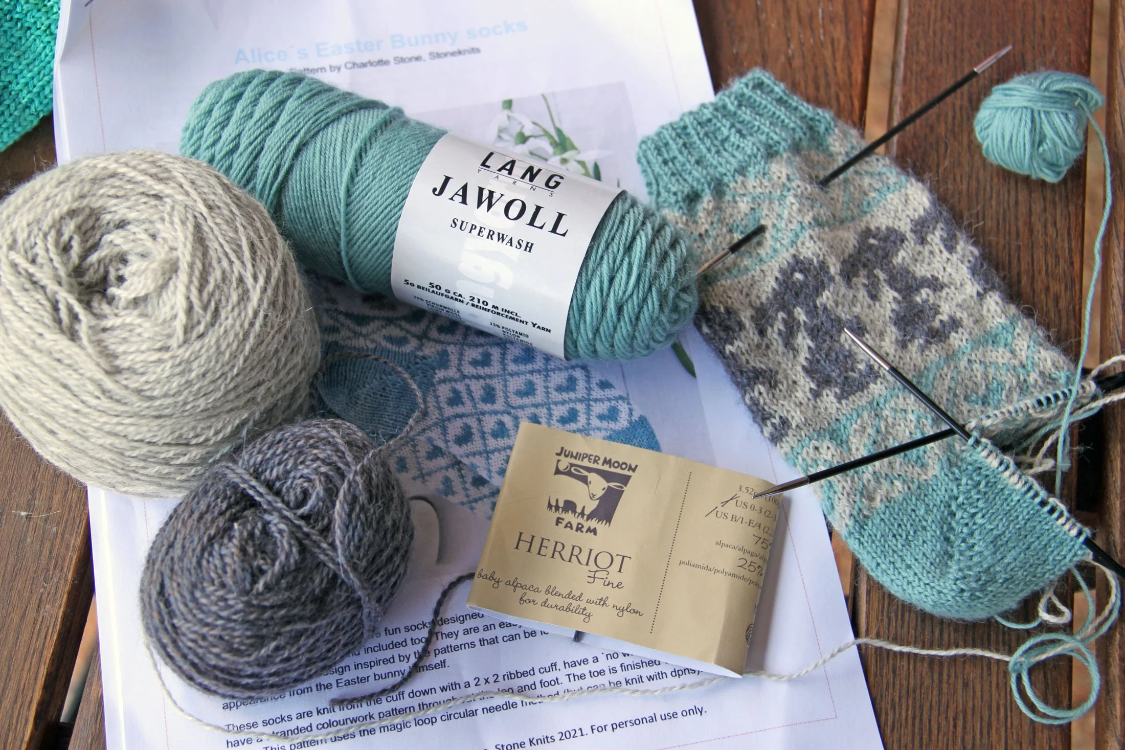 Je suis sous le charme des dessins de Charlotte Stone (Stoneknits) et je n’ai pas résisté à ces petits lapins, même si Pâques est passé!
