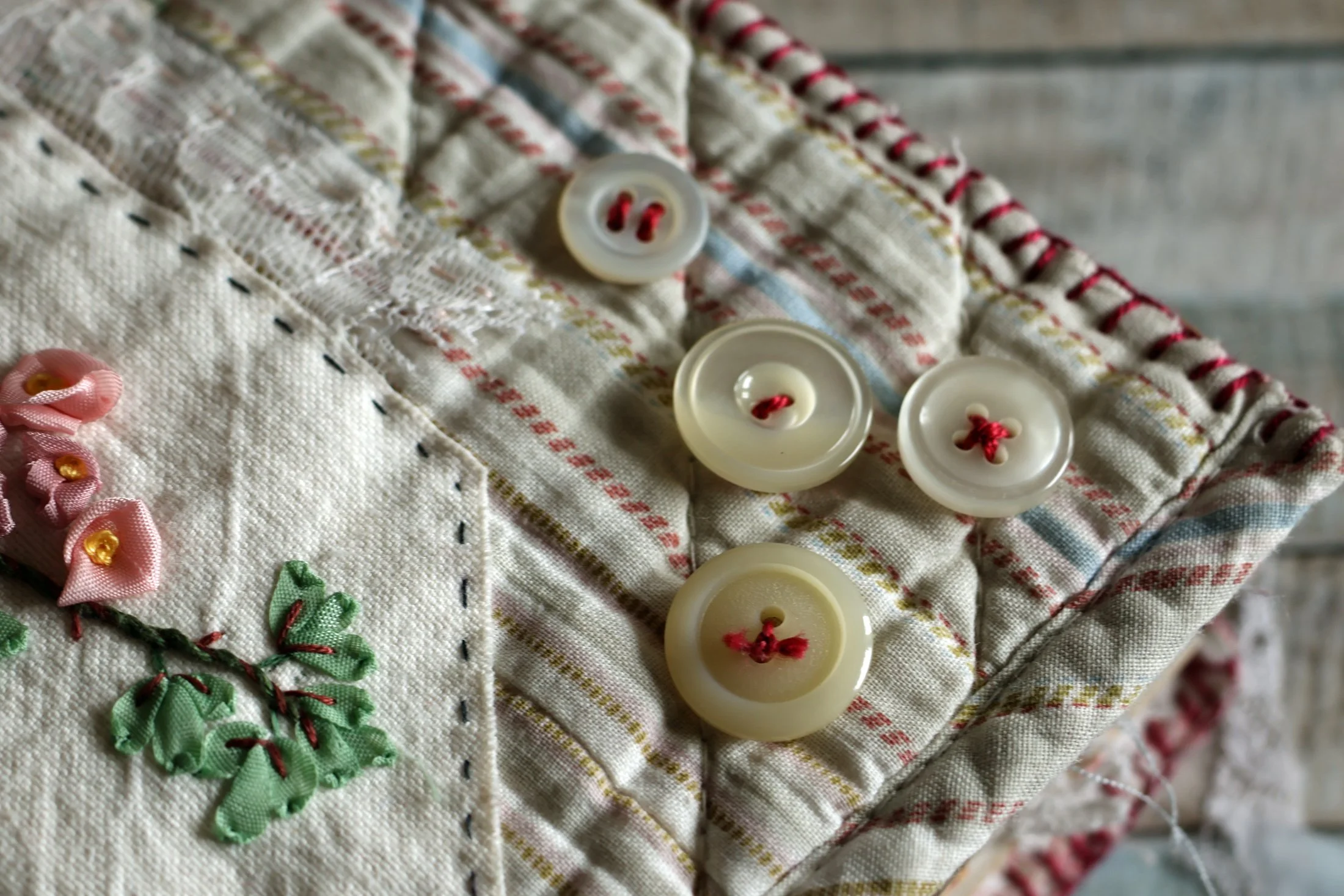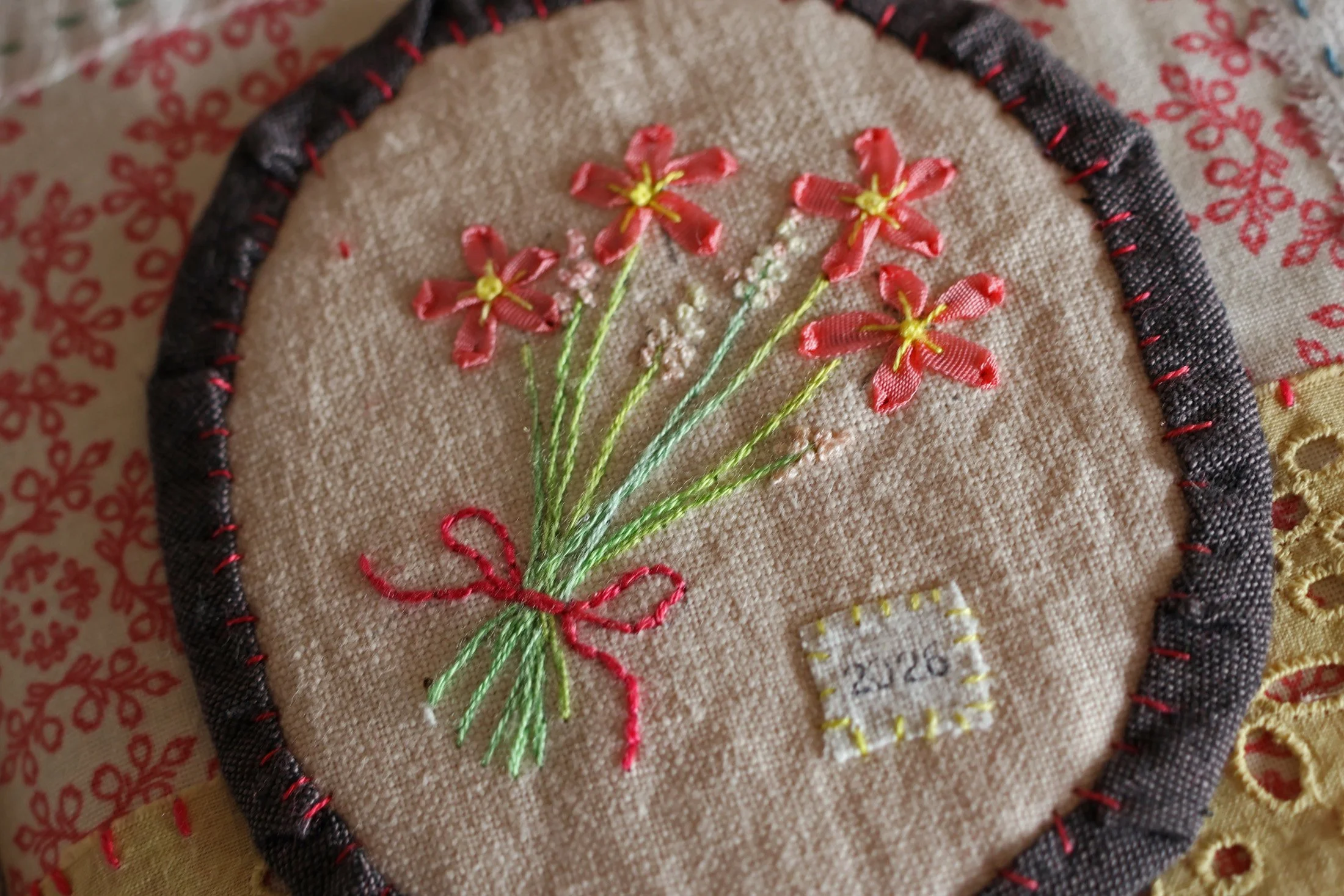 Une broderie sur du lin, placée sur un molleton et “encadrée” à la façon d’un petit tableau