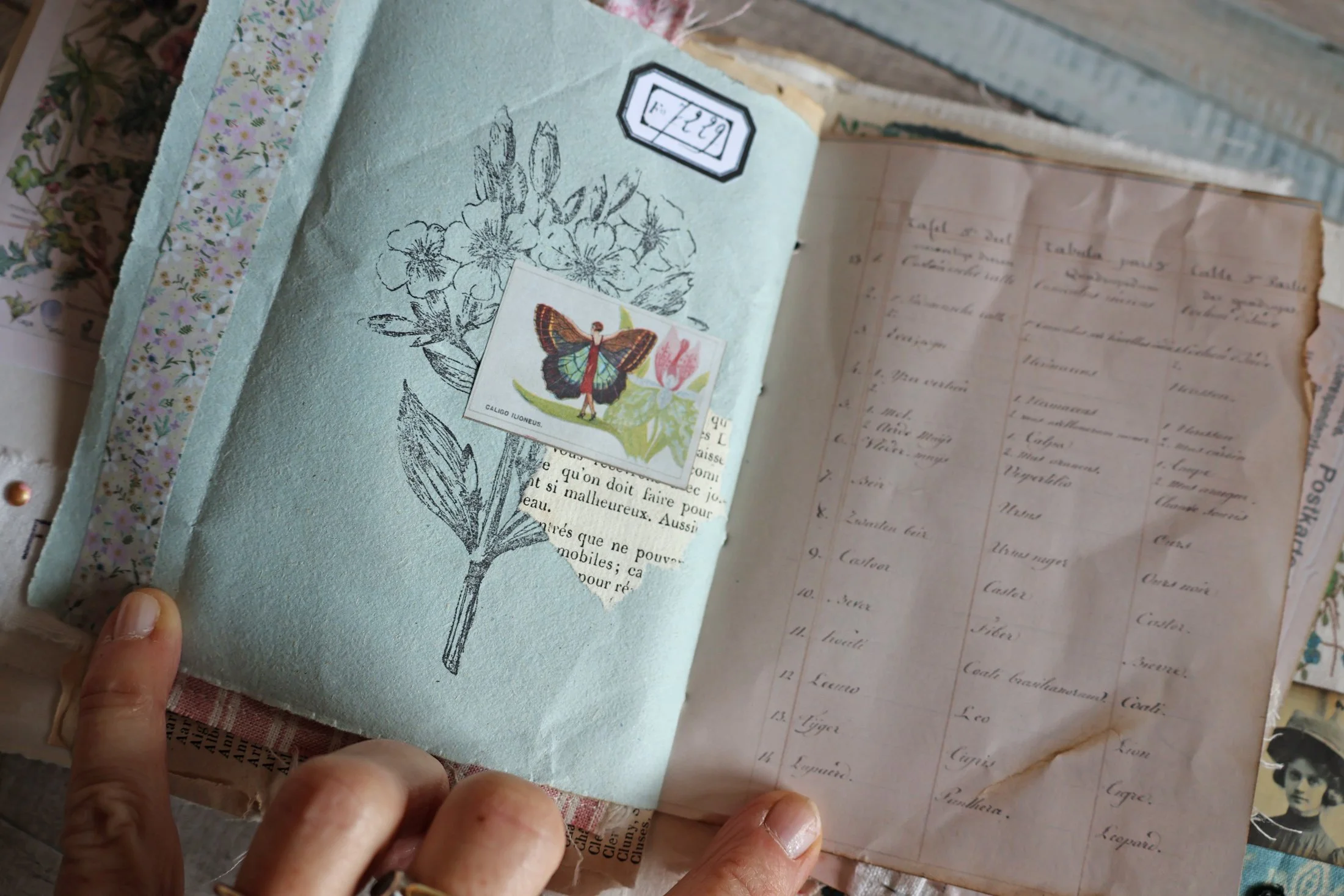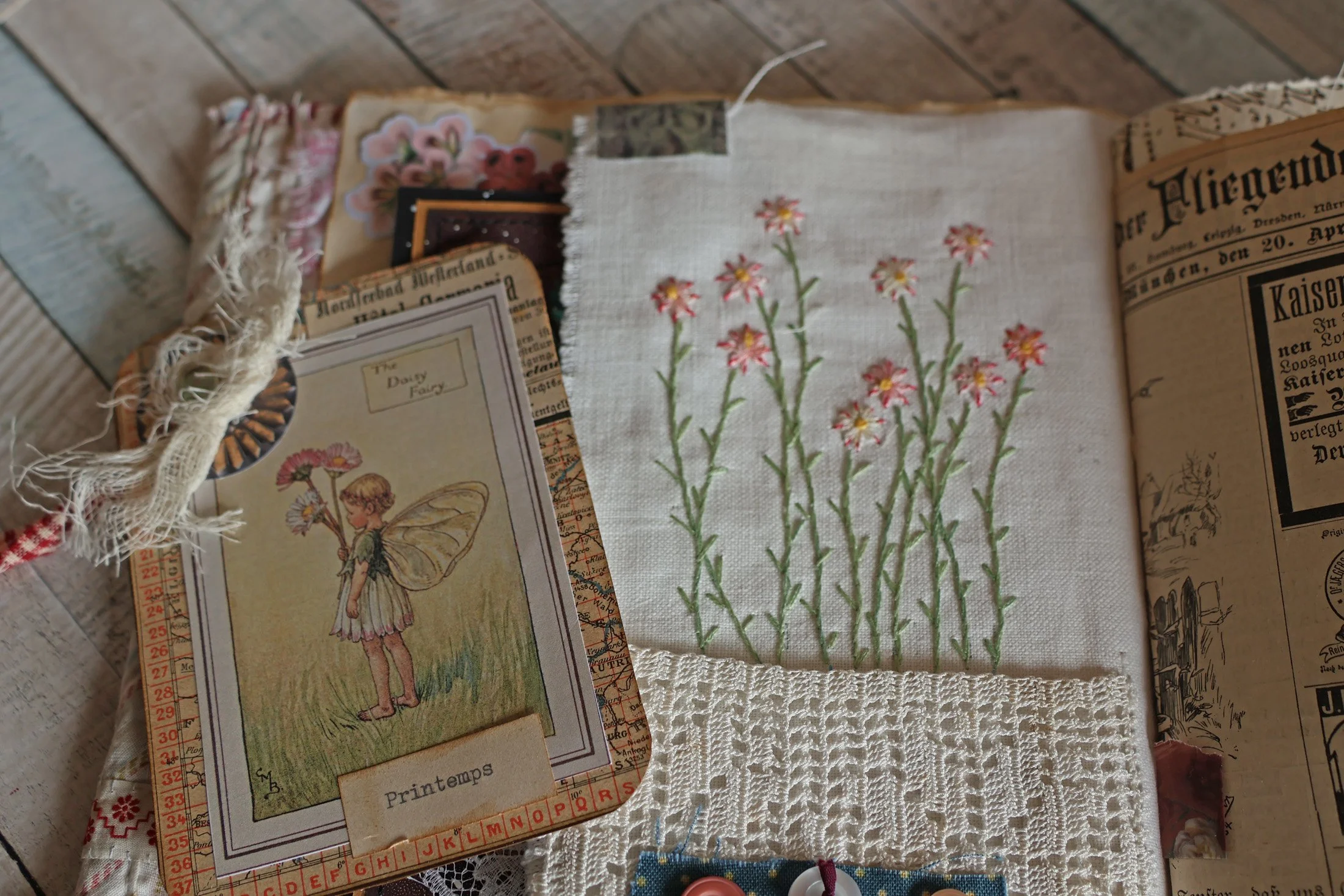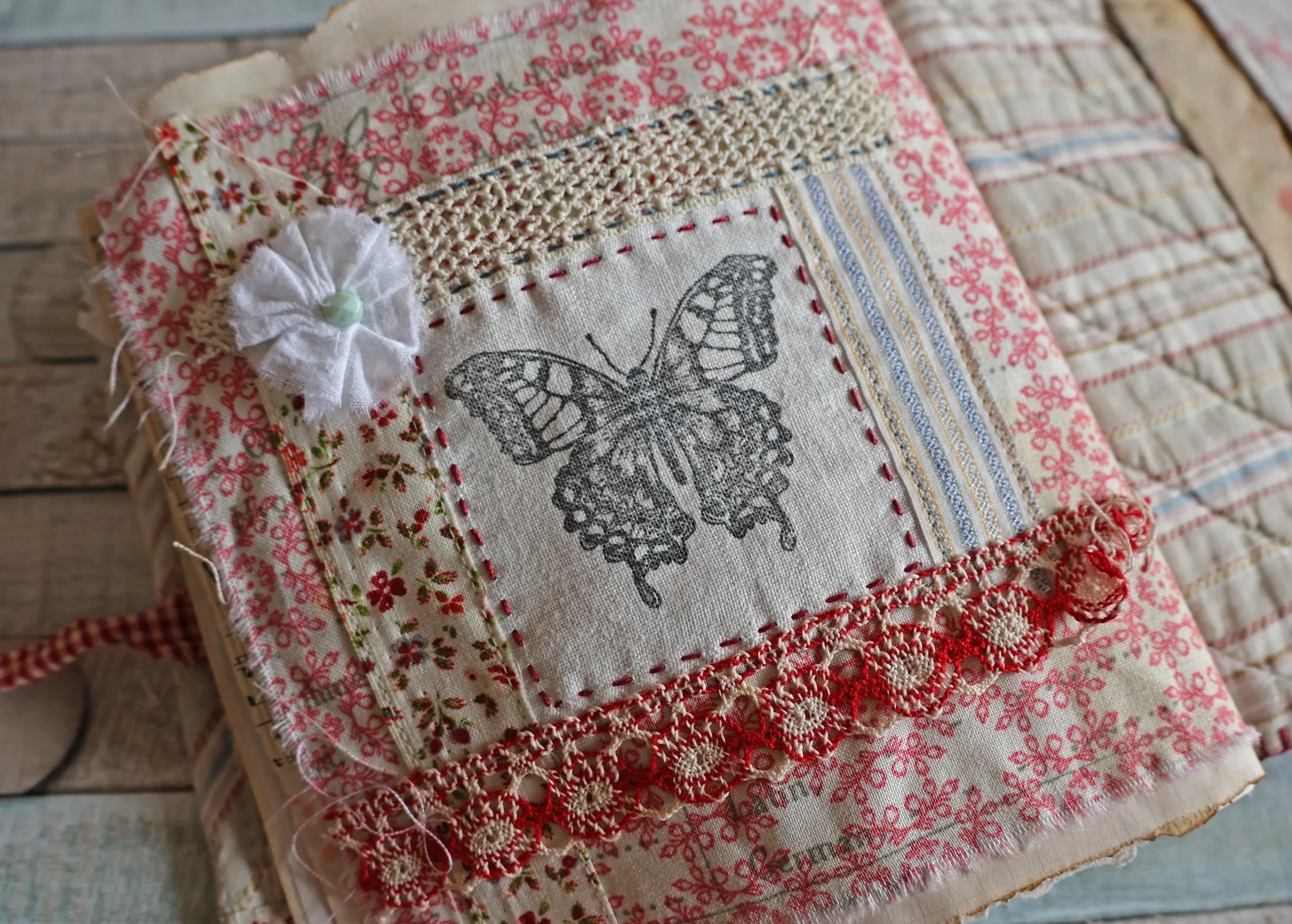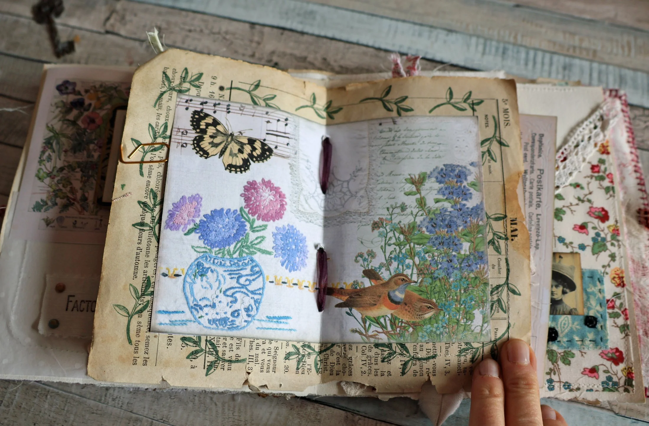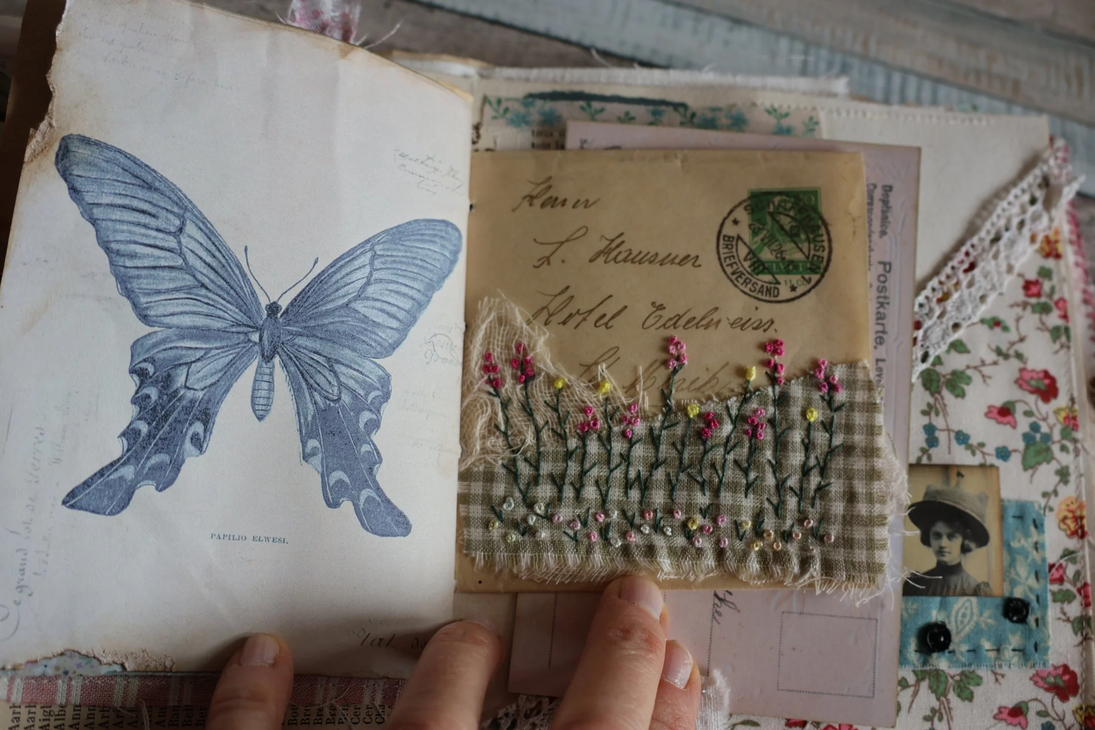 Et pour terminer, une page tout en légèreté avec ce papillon simplement tamponné sur du drap ancien et encadré.