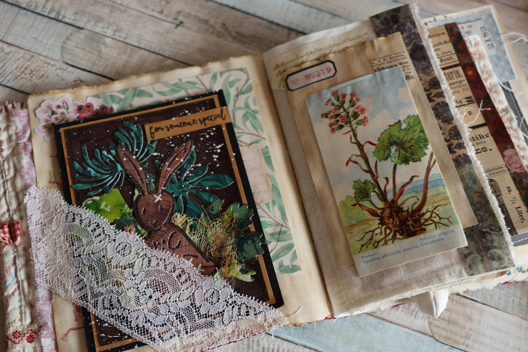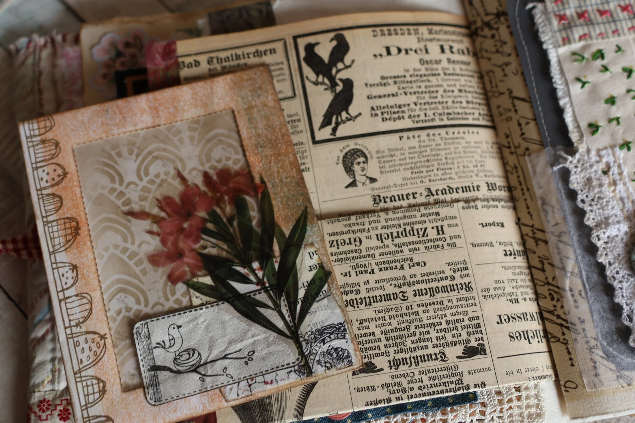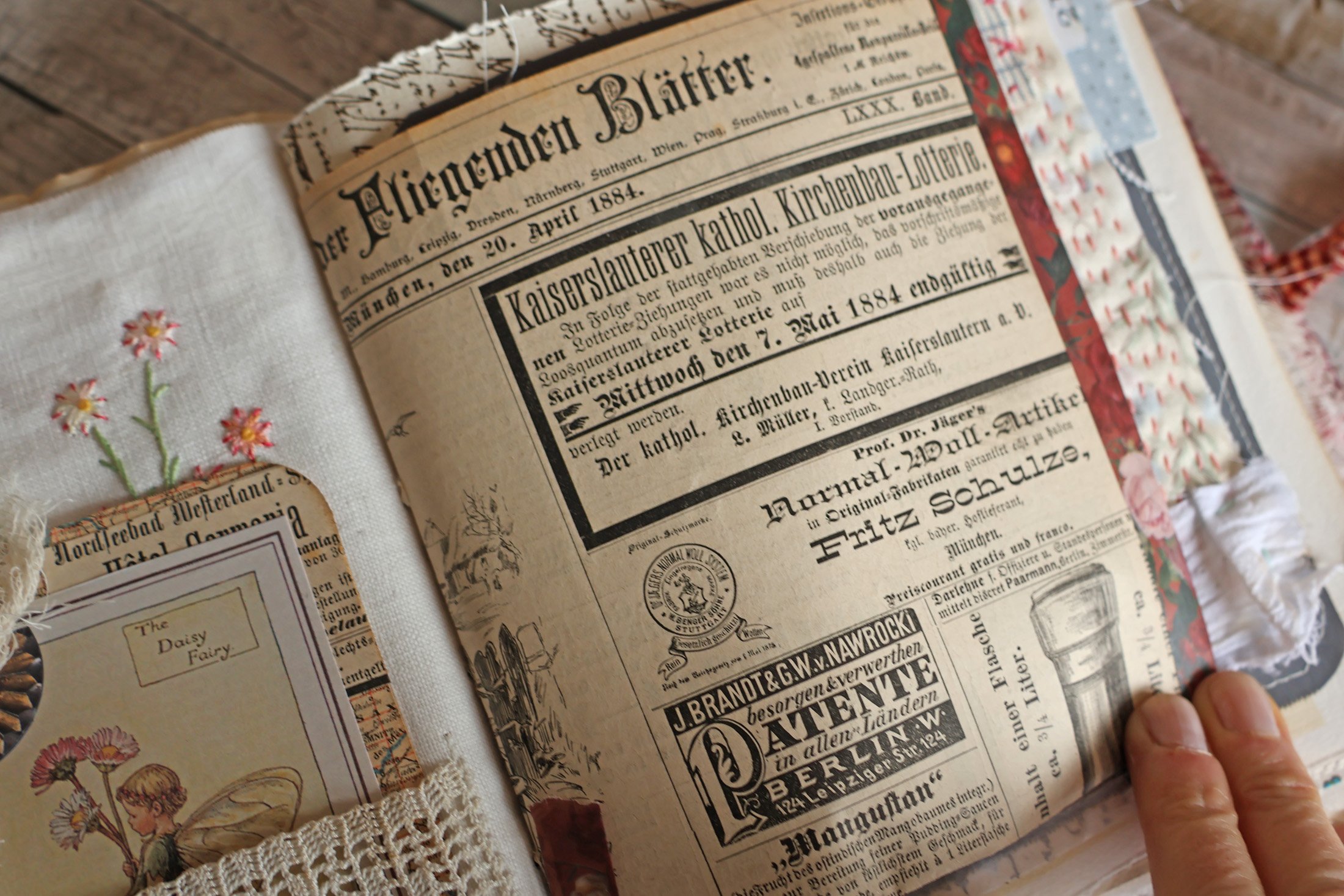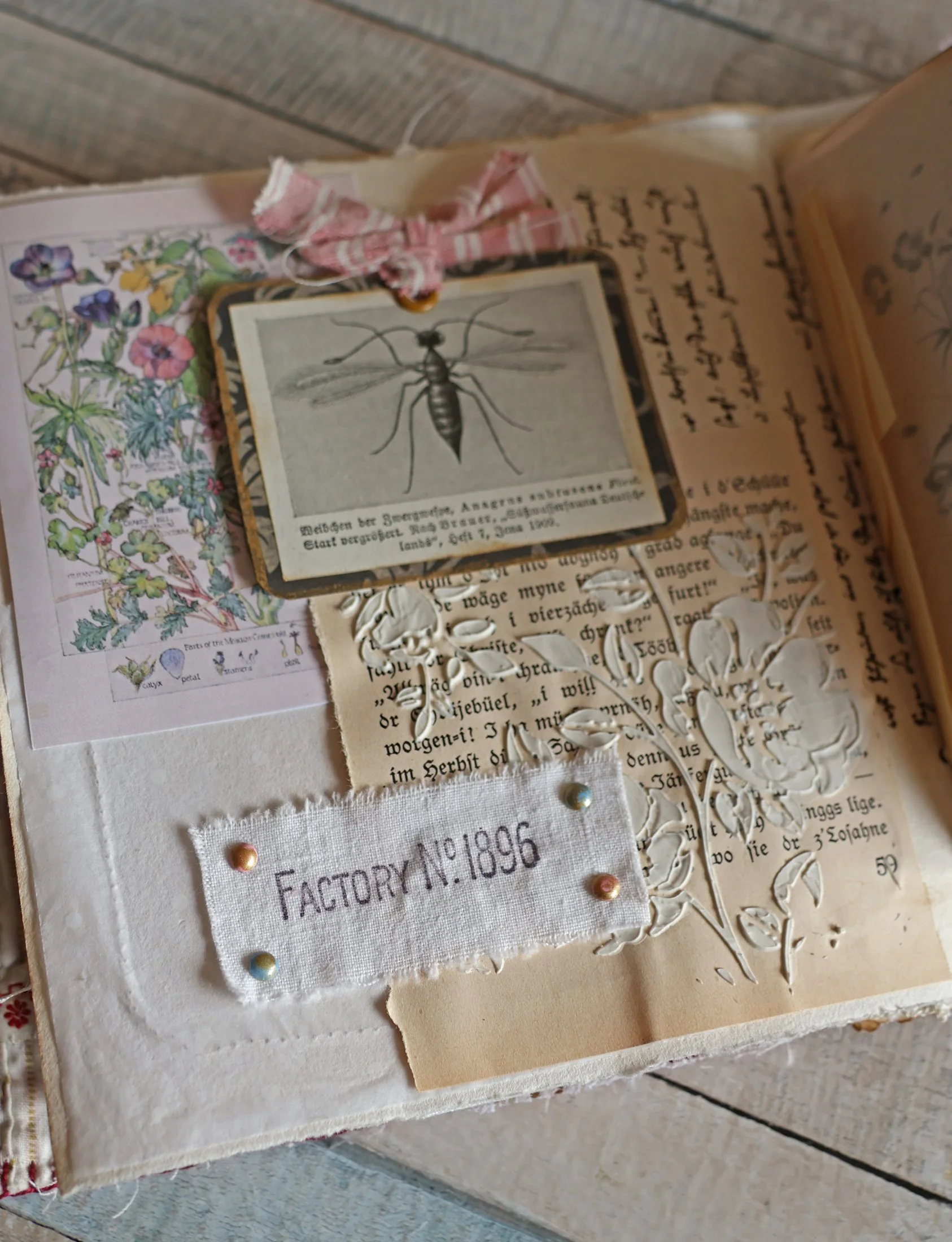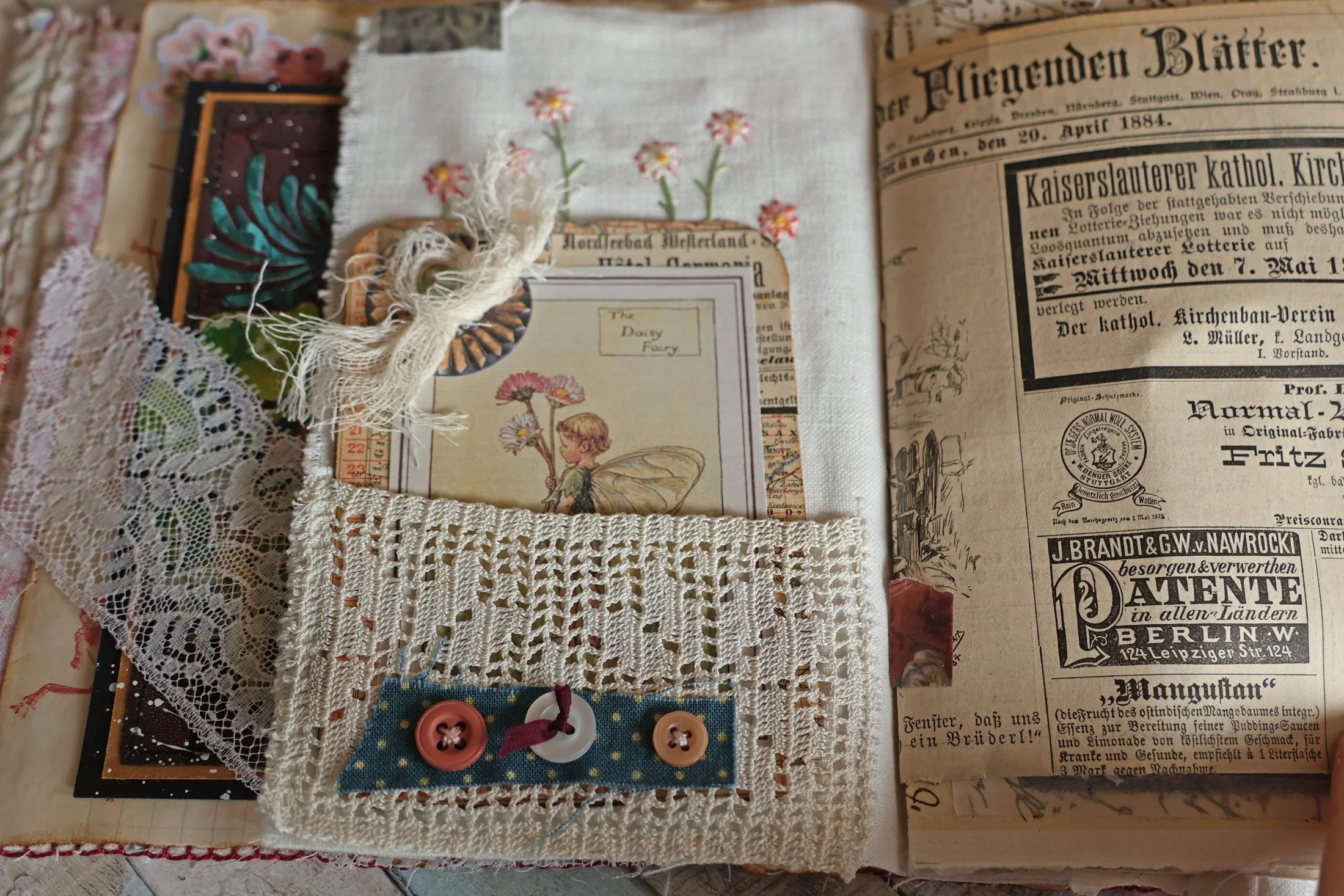 Et pour terminer, une page tout en légèreté avec ce papillon simplement tamponné sur du drap ancien et encadré.