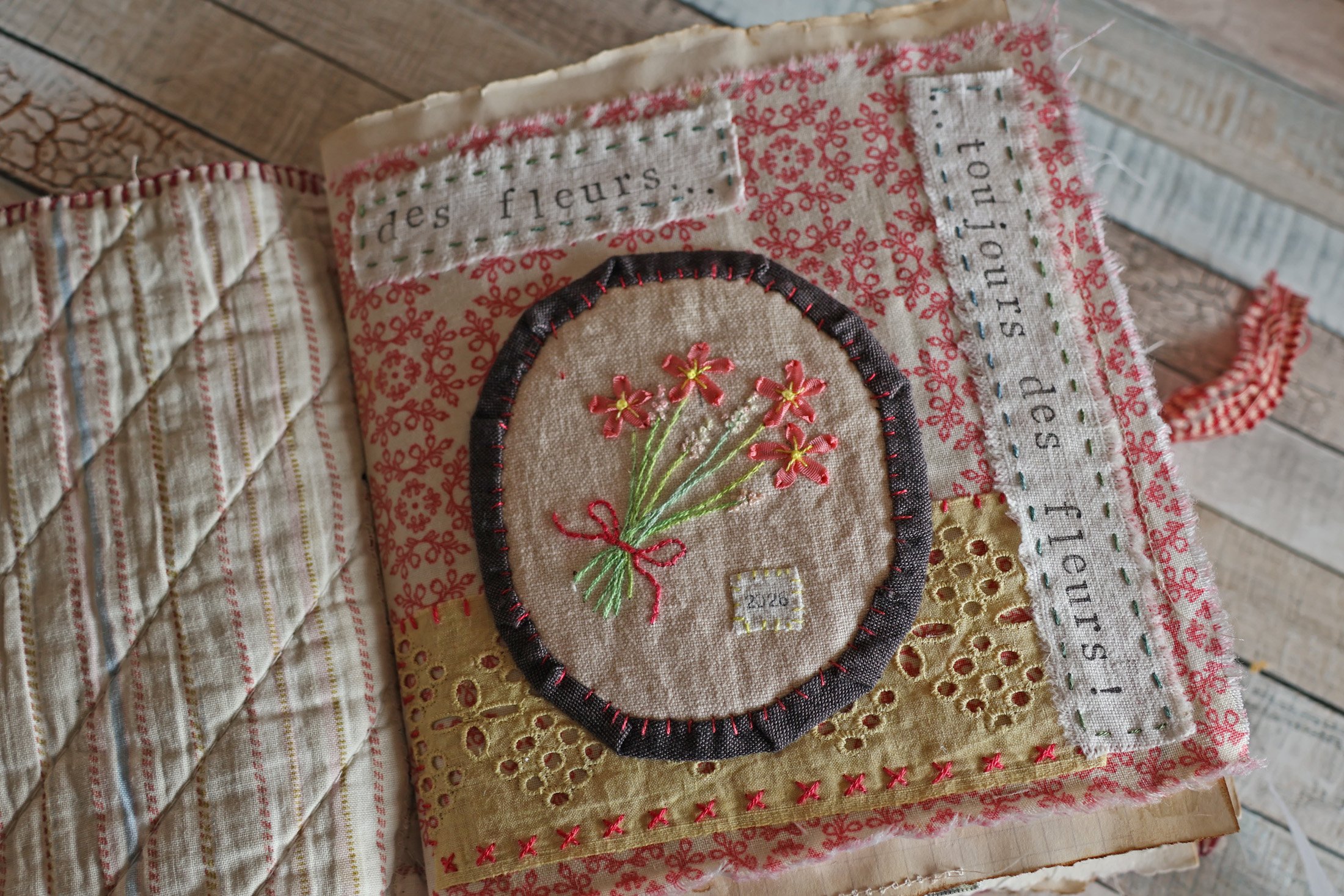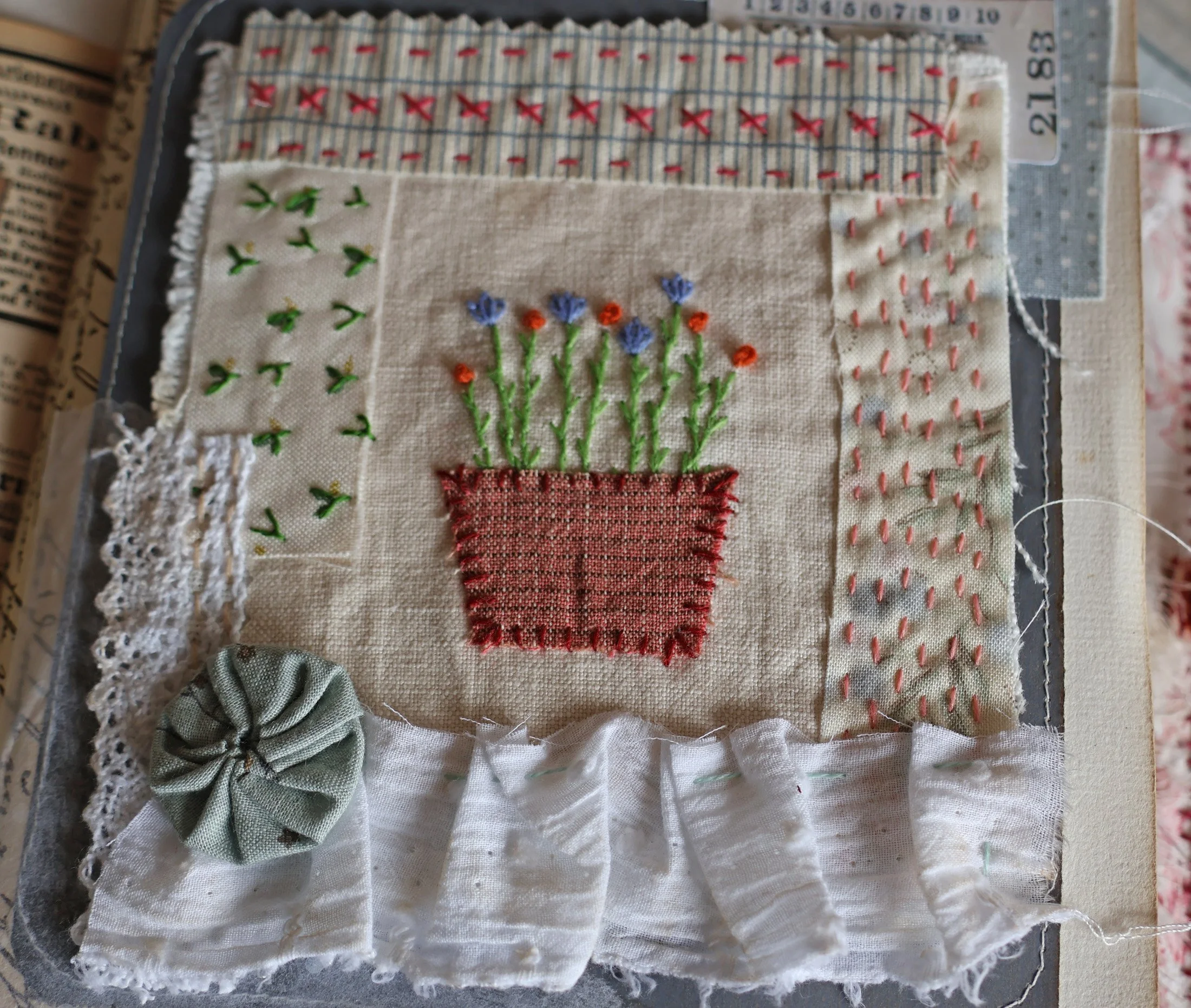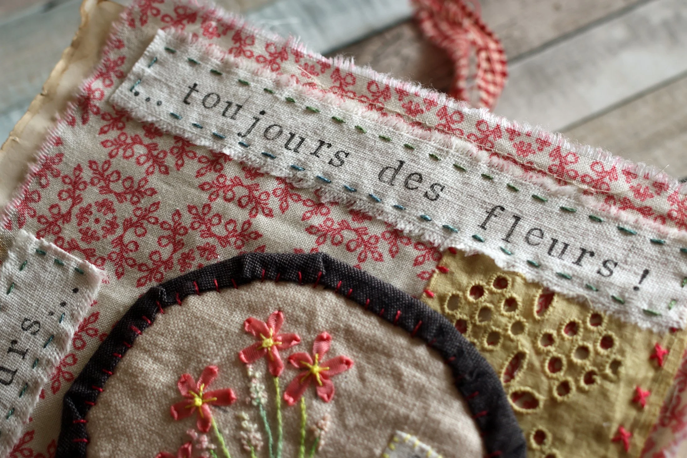 Une autre broderie mise en valeur dans un cadre de collages textiles.