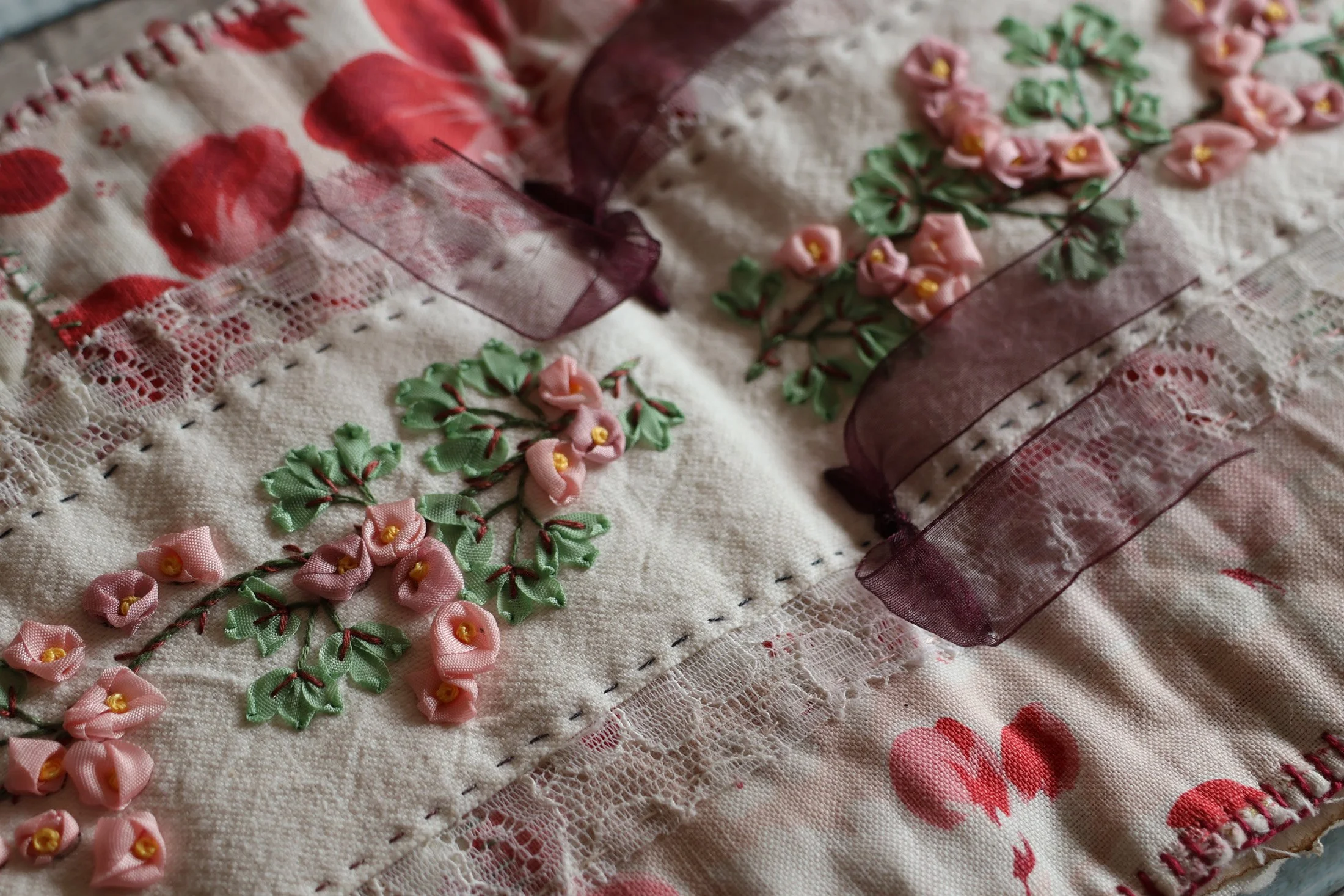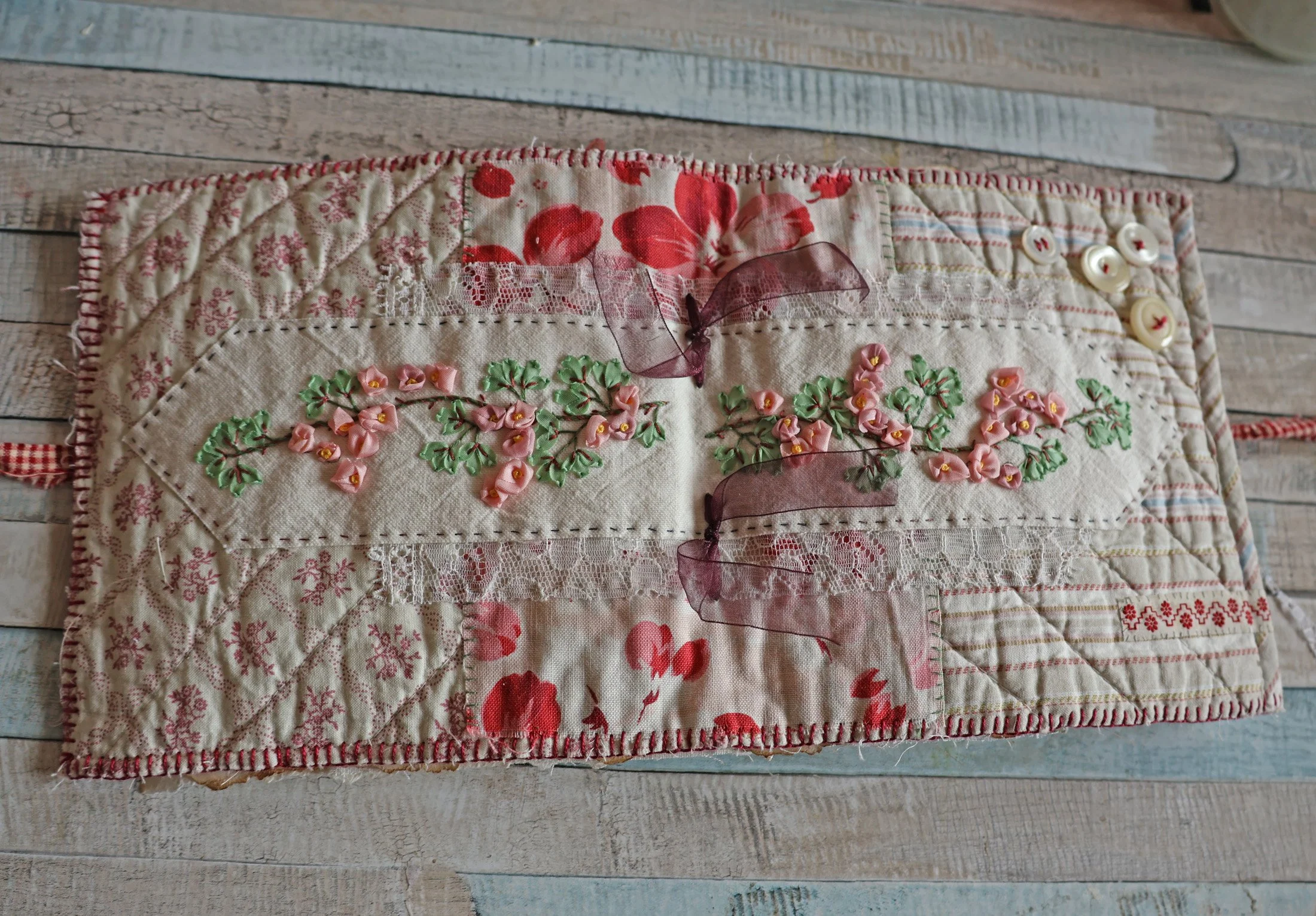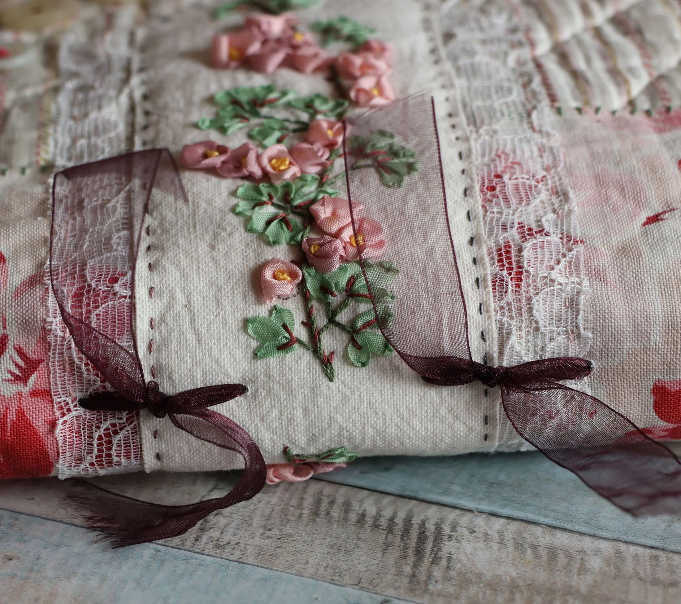 Une autre broderie mise en valeur dans un cadre de collages textiles.