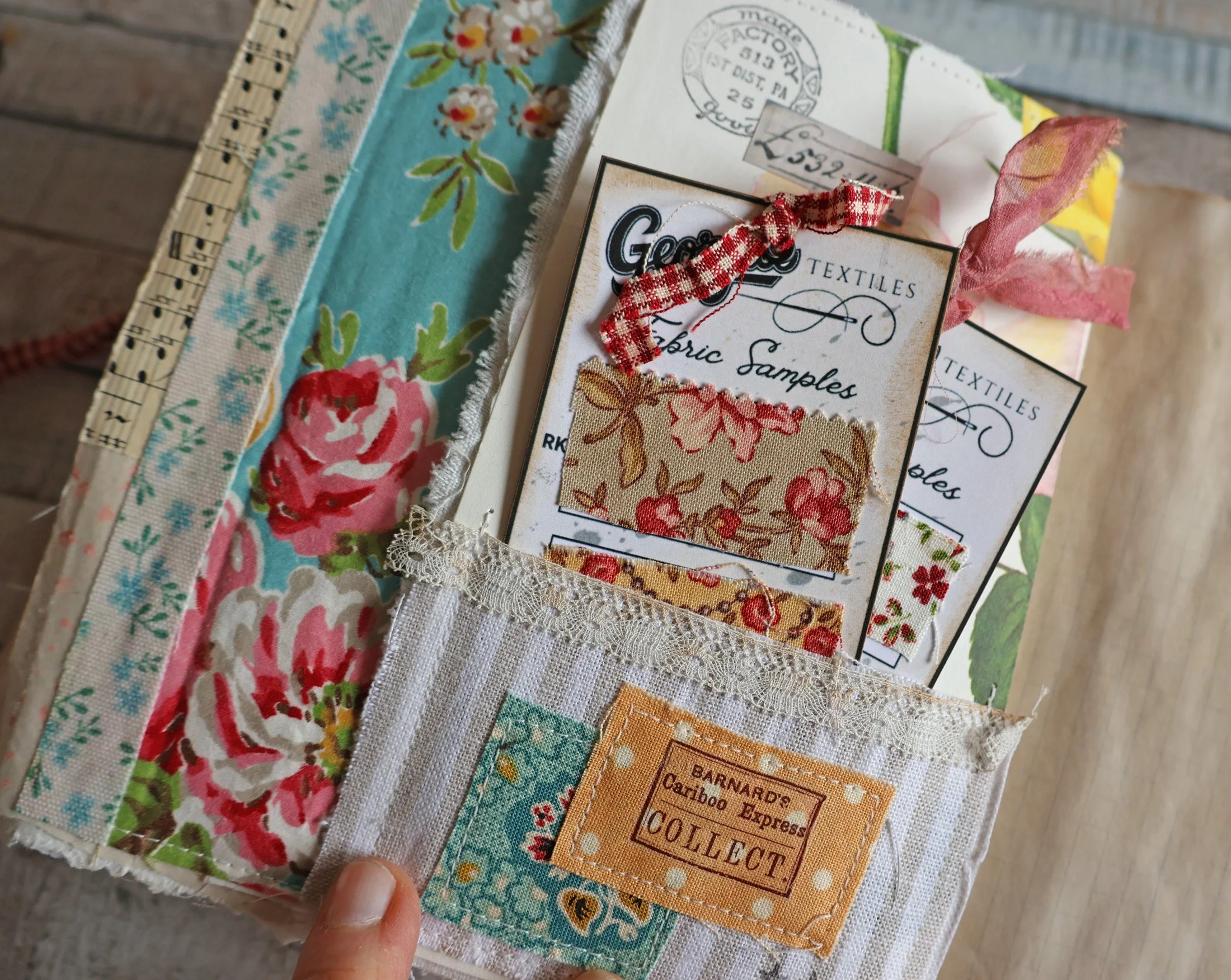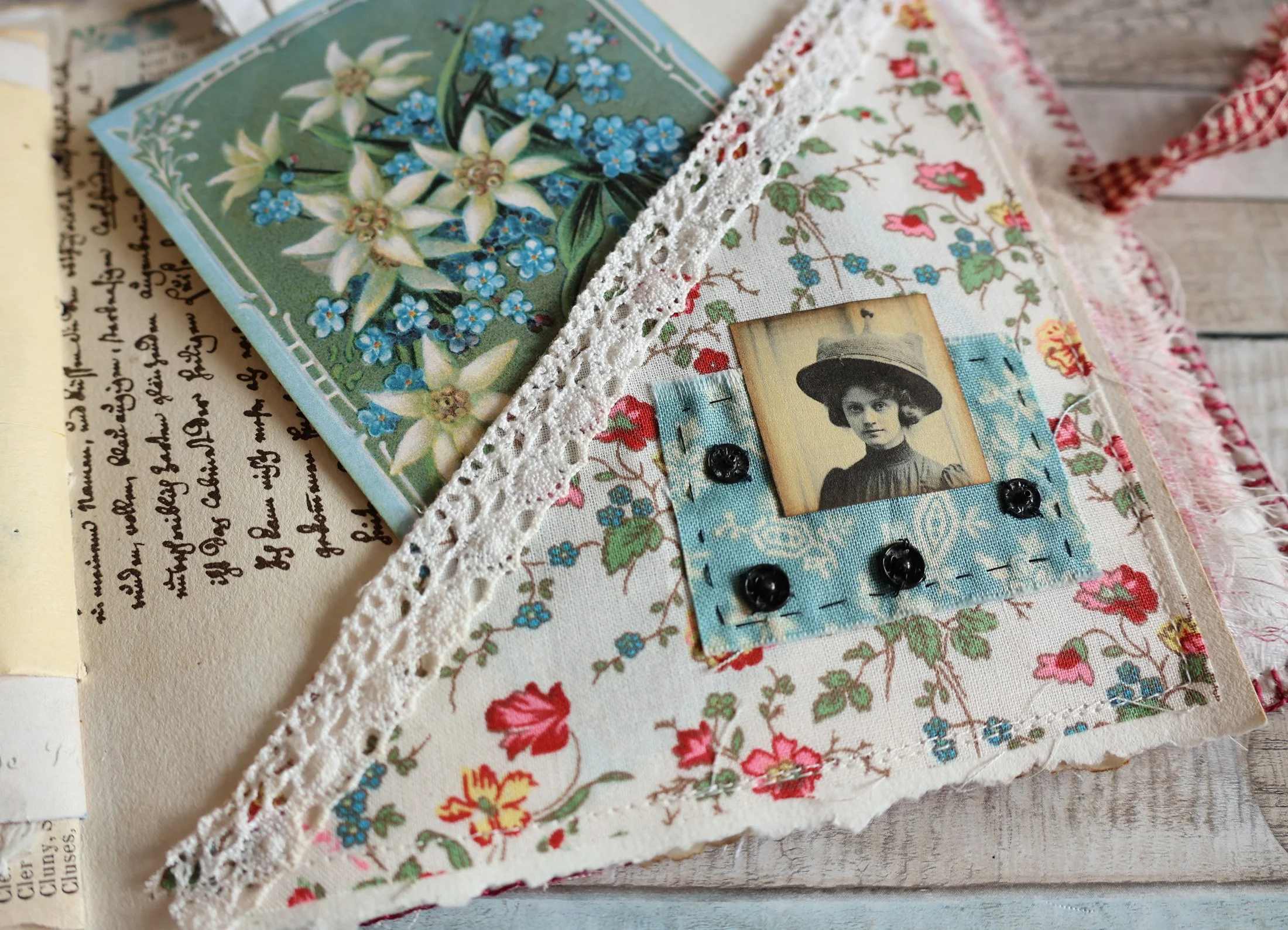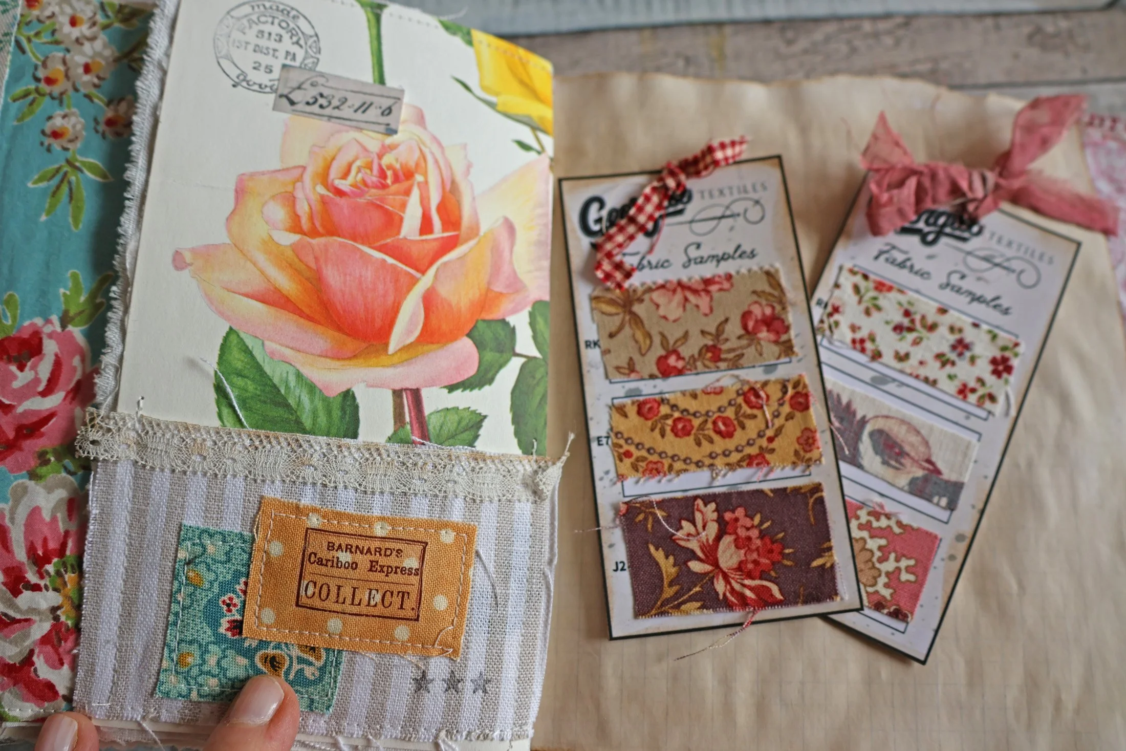 Ces petites cartes proviennent de pages imprimables téléchargées chez Jennifer Beebe . J’y ai collé des “échantillons” de tissus fleuris et j’aime bien le rendu!