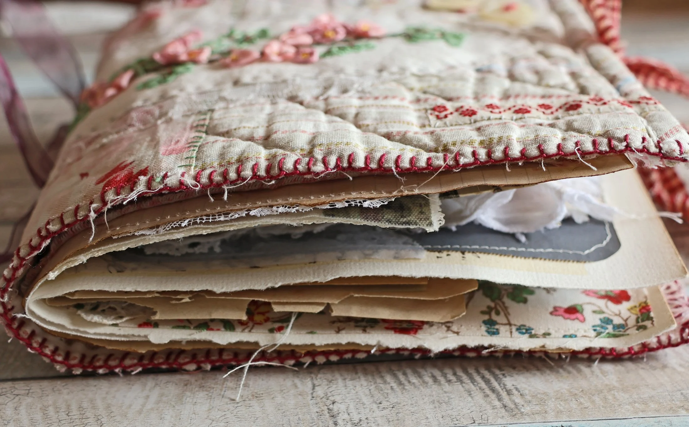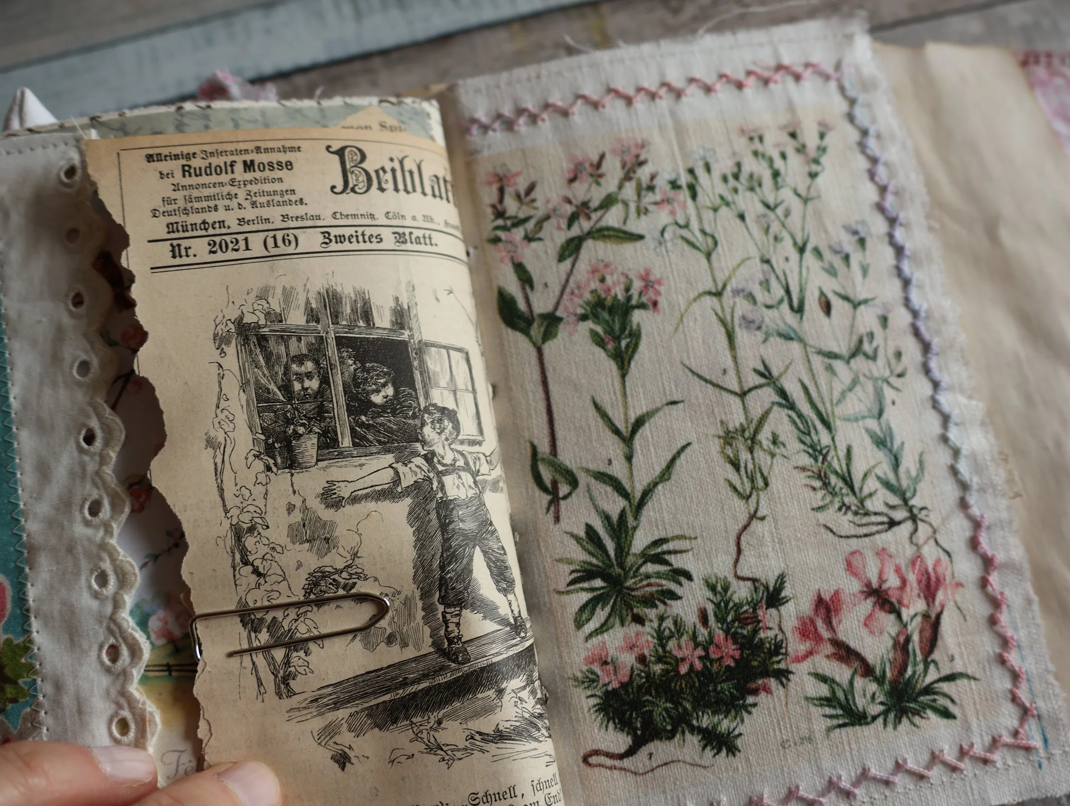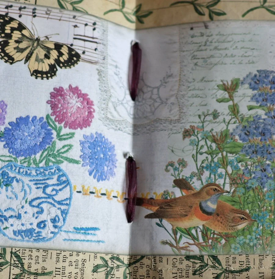 … et la technique très simple de reliure avec 2 morceaux de ruban piqués au milieu des pages et noués à l’extérieur.