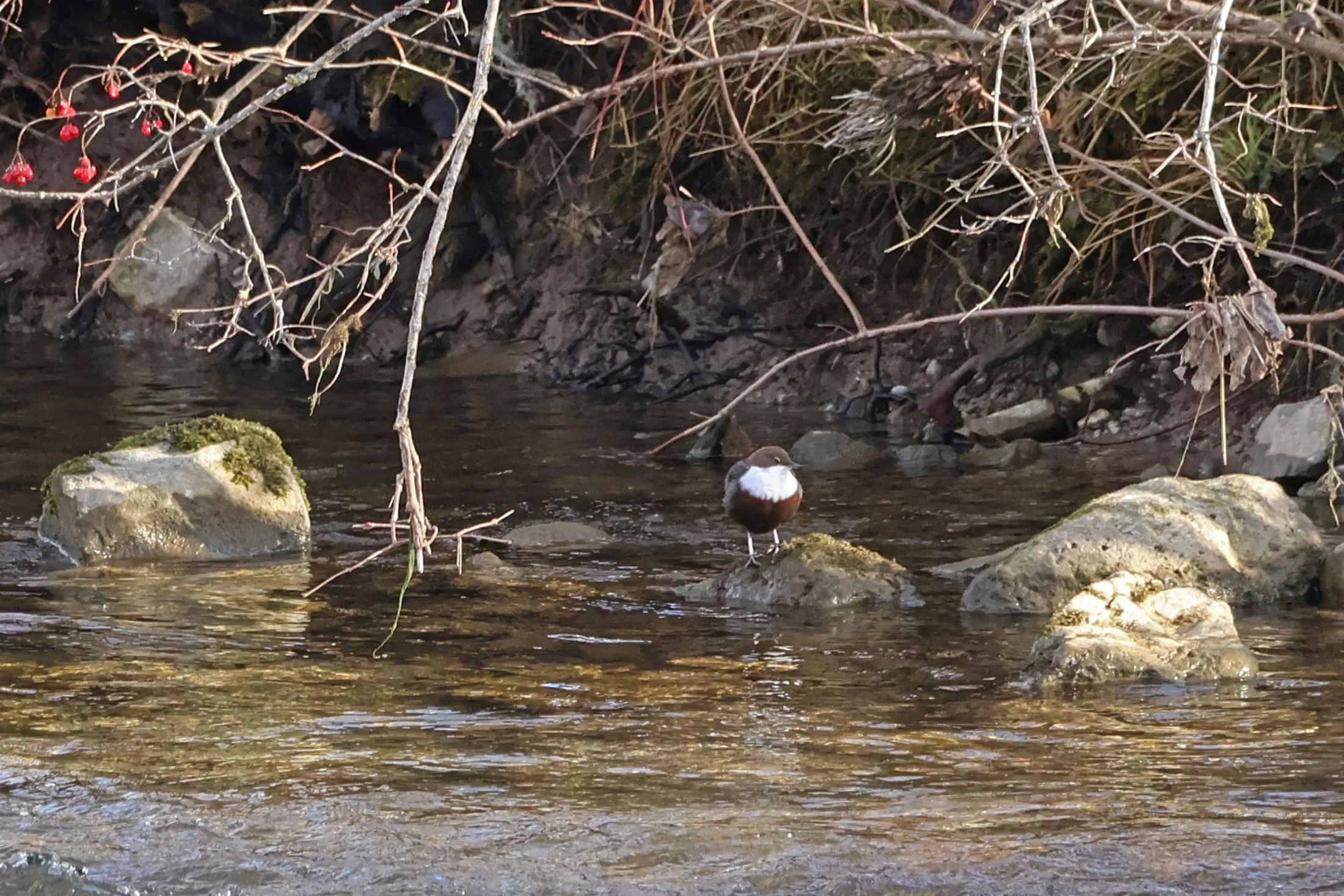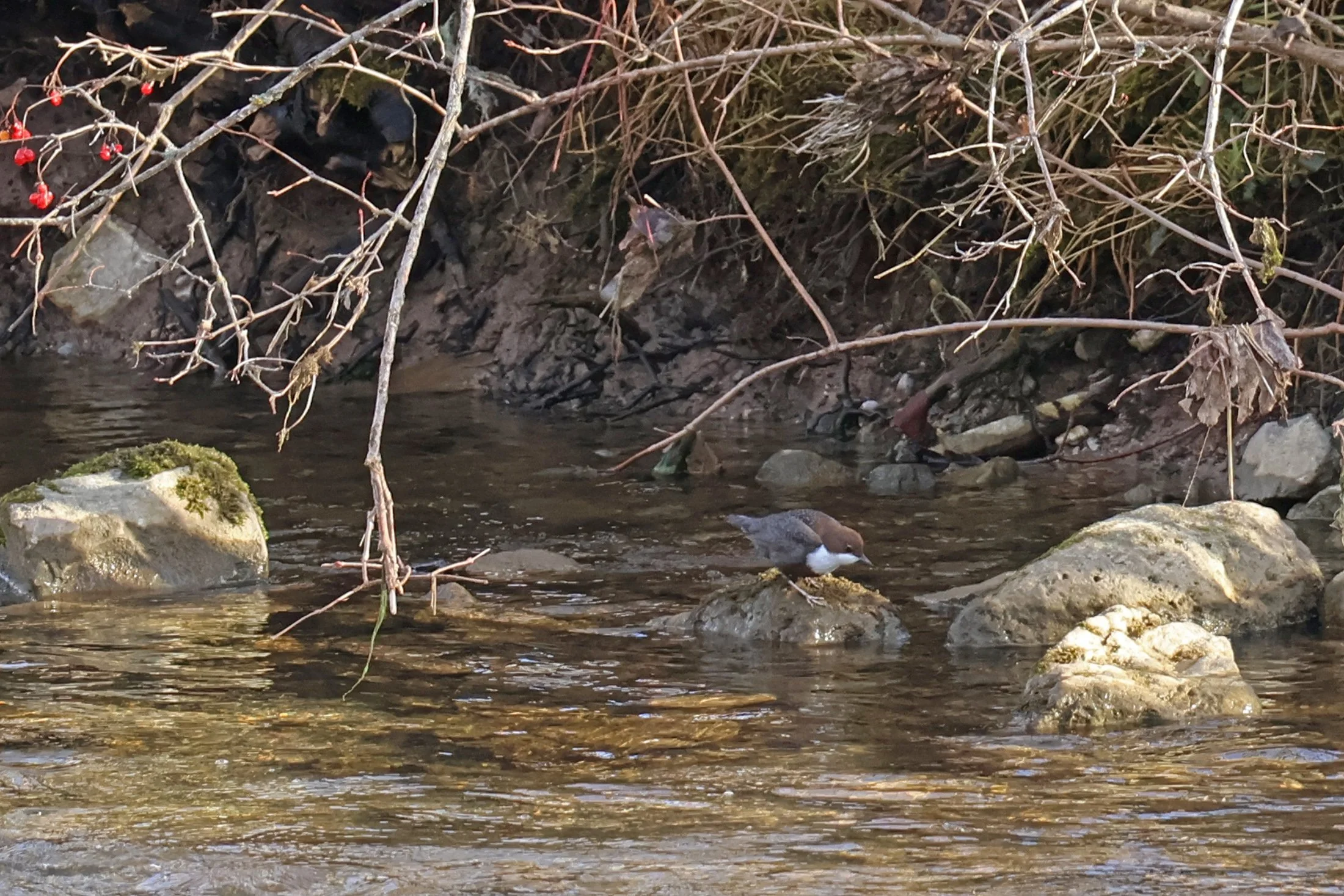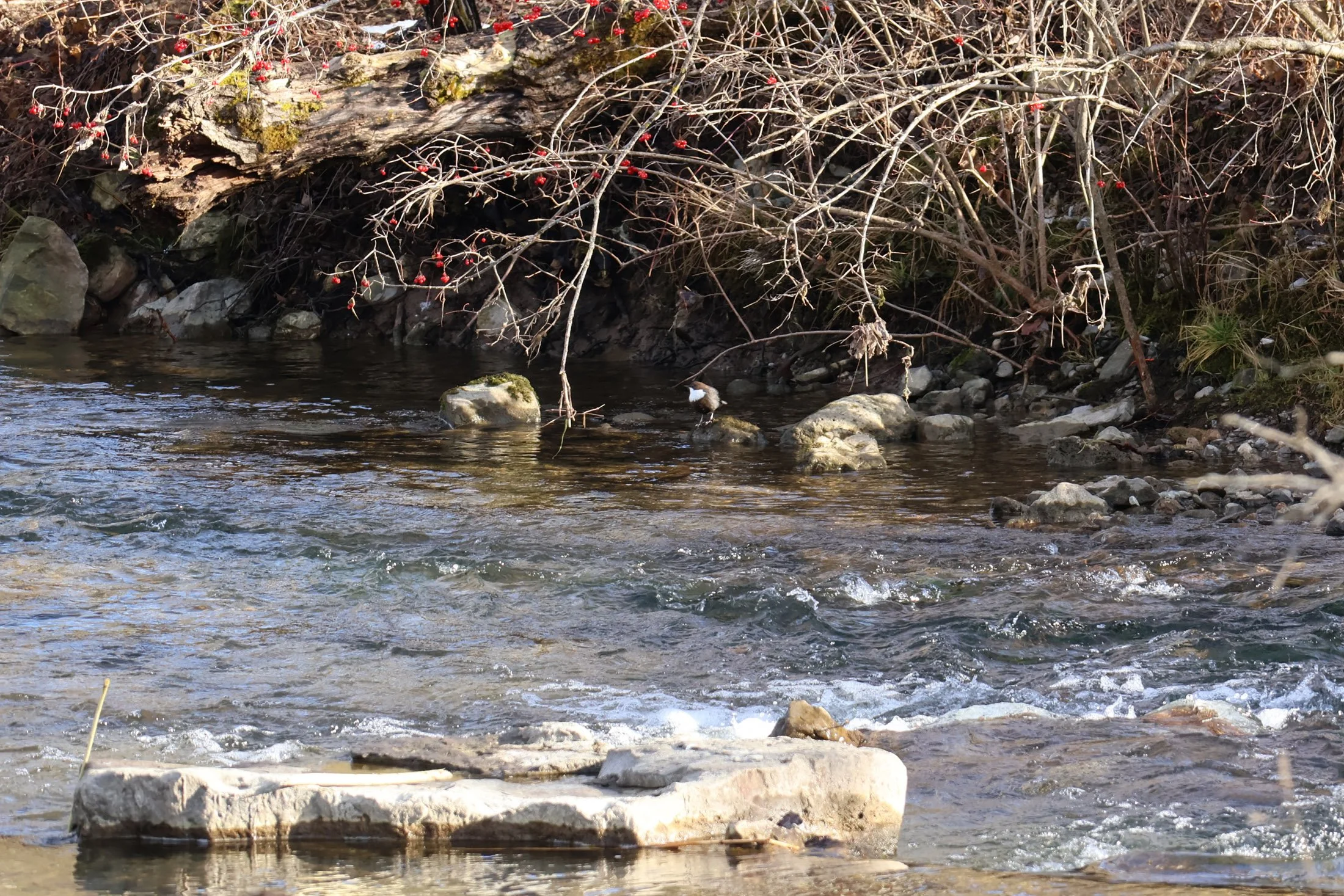 Malheureusement un peu loin pour la photo, mais on le reconnaît bien à sa gorge blanche: c’es le cincle plongeur. Ce petit oiseau capable de nager dans les rivières pour aller chercher de la nourriture au fond de l’eau, il affronte le courant des torrents avec vivacité.