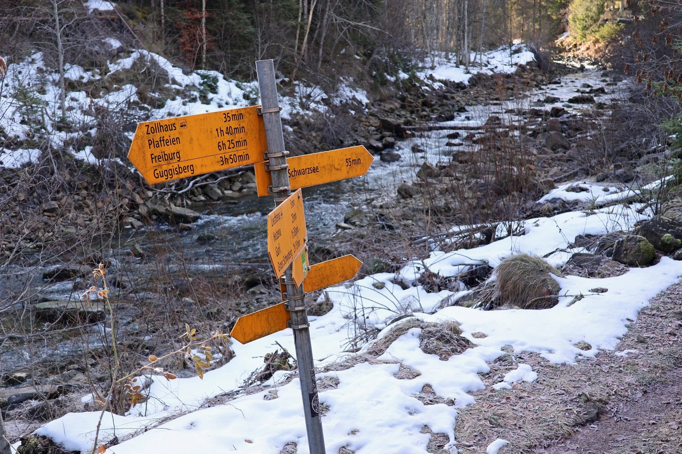 Ce n’est pas gagné d’avance car nous avons décidé de remonter un bout de la Singine. Et comme le sentier qui suit la rivière est bien emmitouflé dans la vallée, au départ, on ne voit pas beaucoup de soleil.