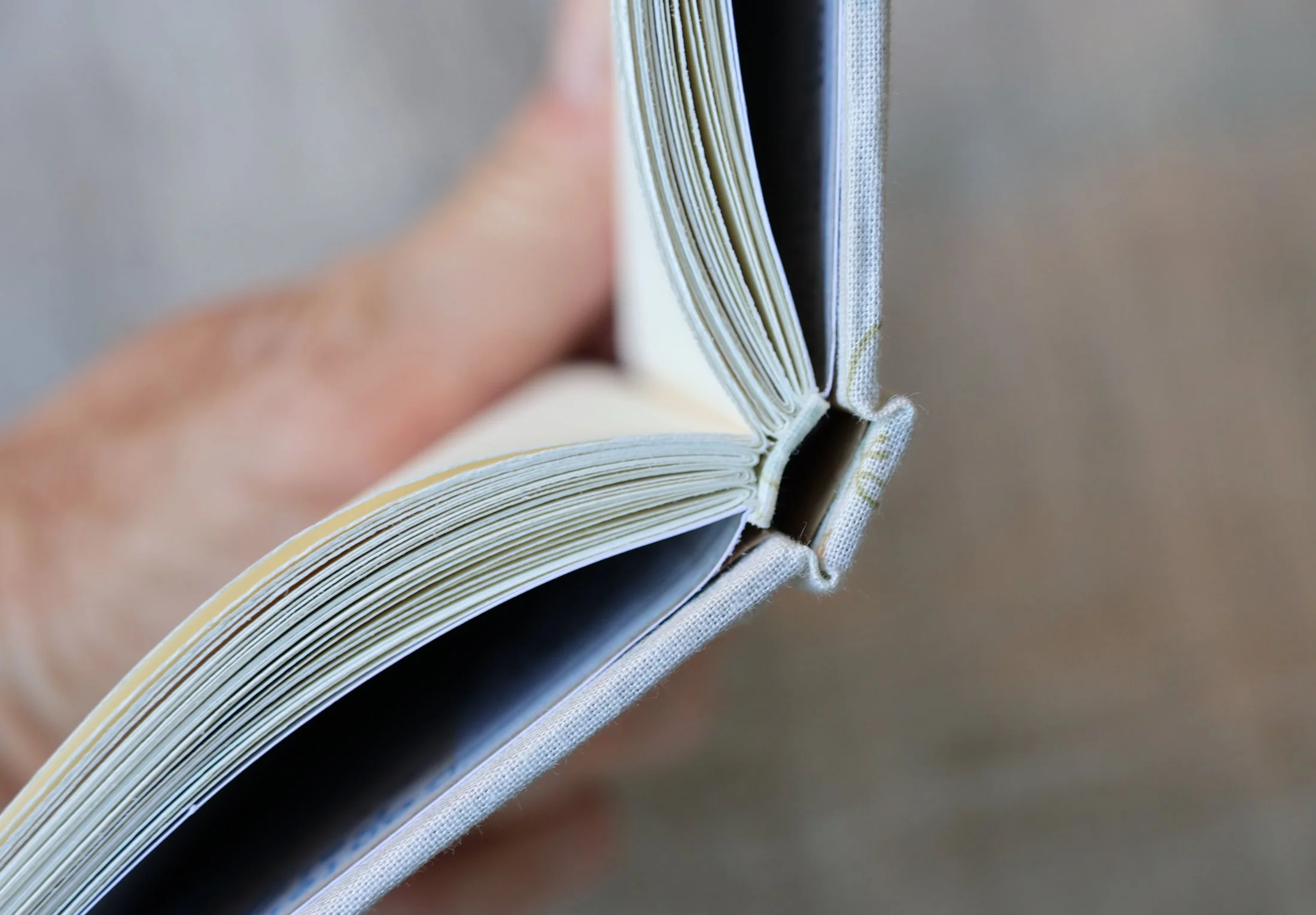 Une technique quasiment pareille: également avec plusieurs cahiers assemblés, mais le dos n’est pas cartonné. Il reste donc souple et supporte des grosseurs plus ou moins précises pour les cahiers.