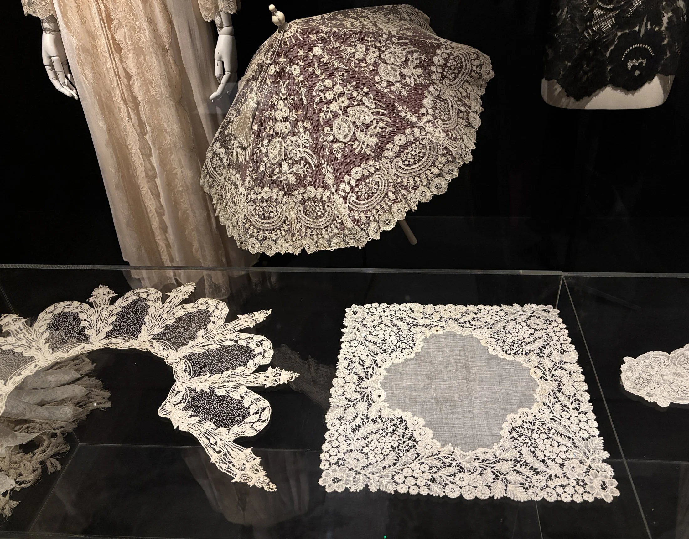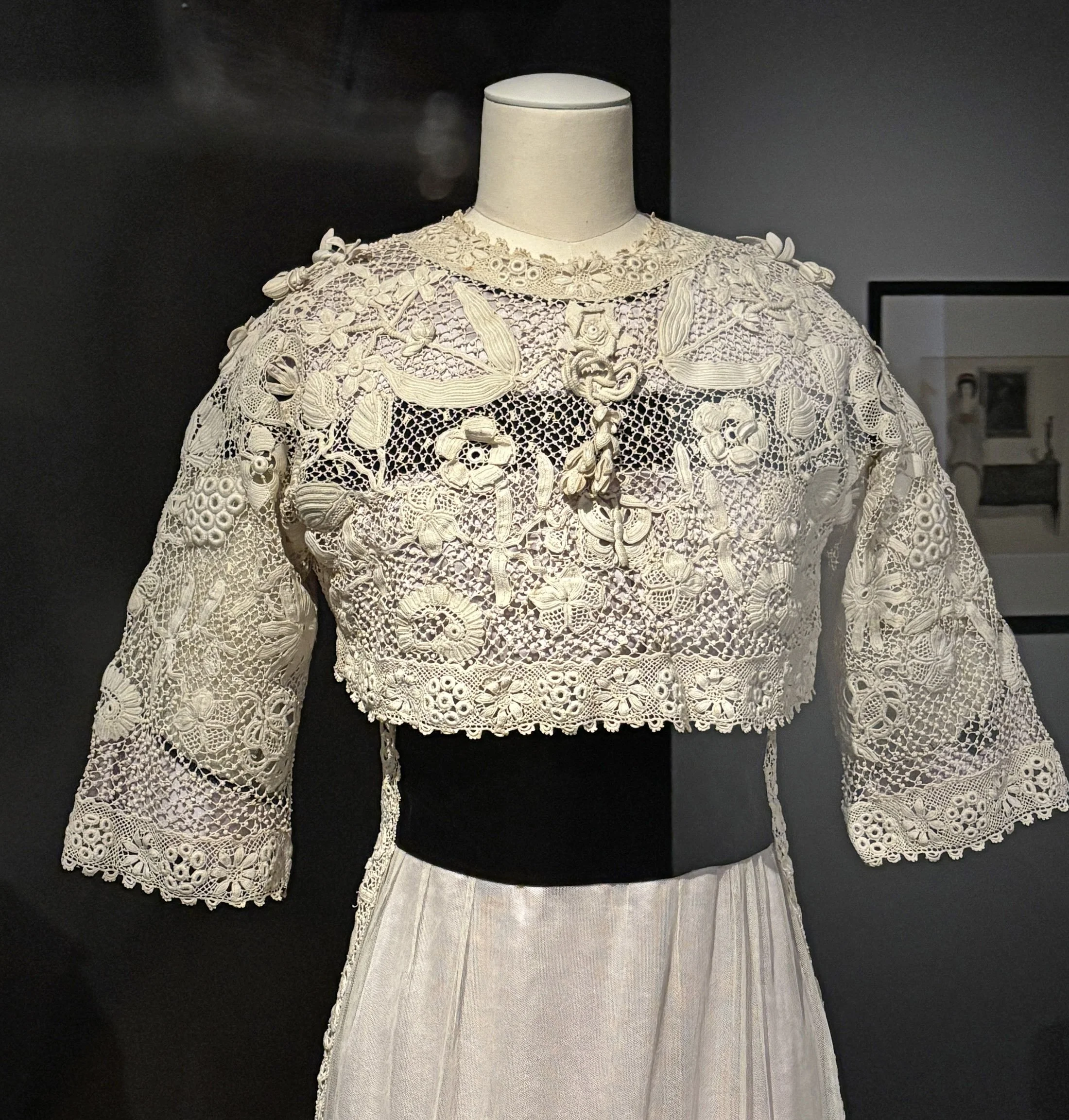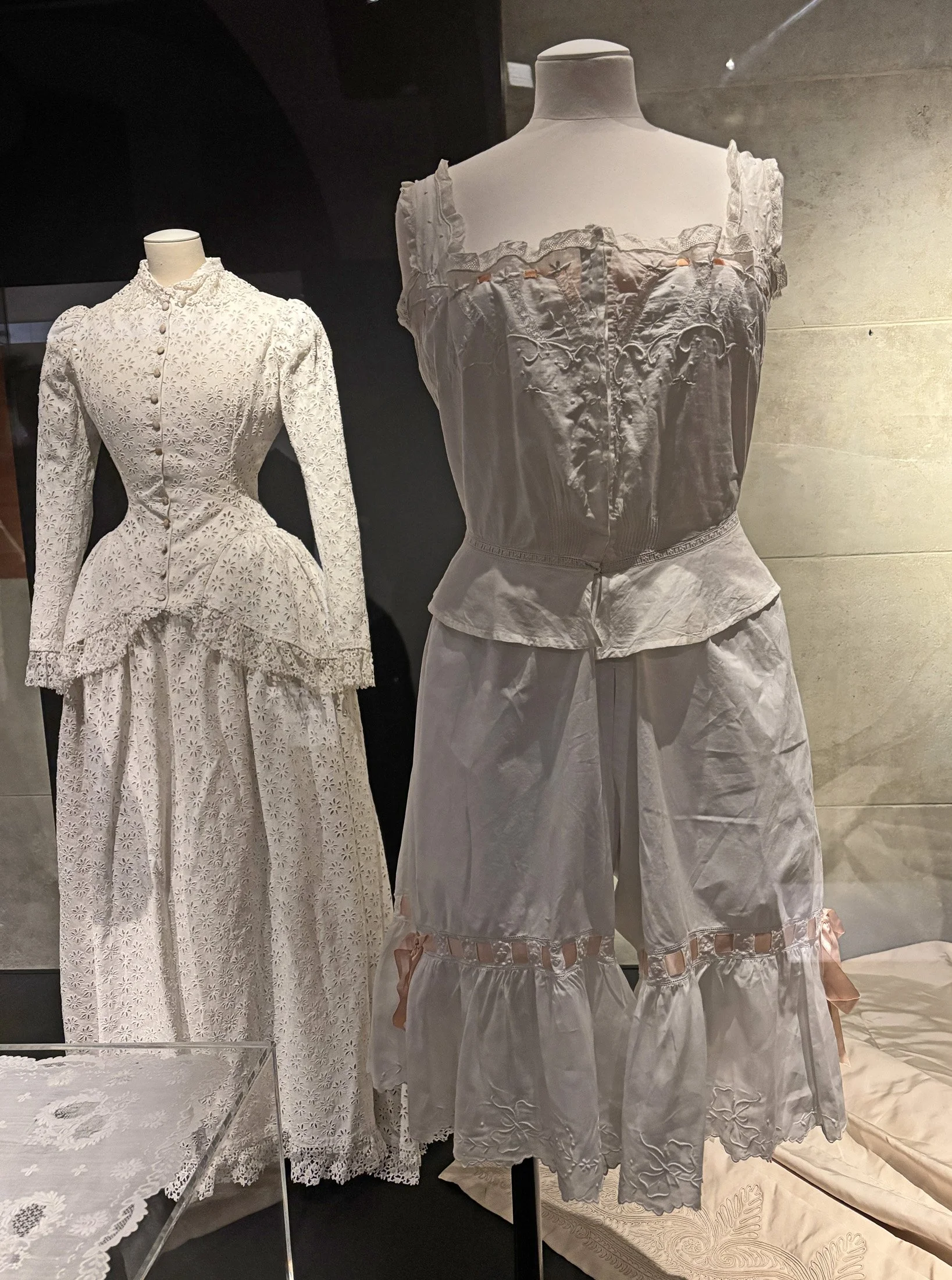 La broderie a aussi orné la lingerie et les dessous. On le découvre ici sur cette tenue, cache-corset et pantalon, qui date de 1900.