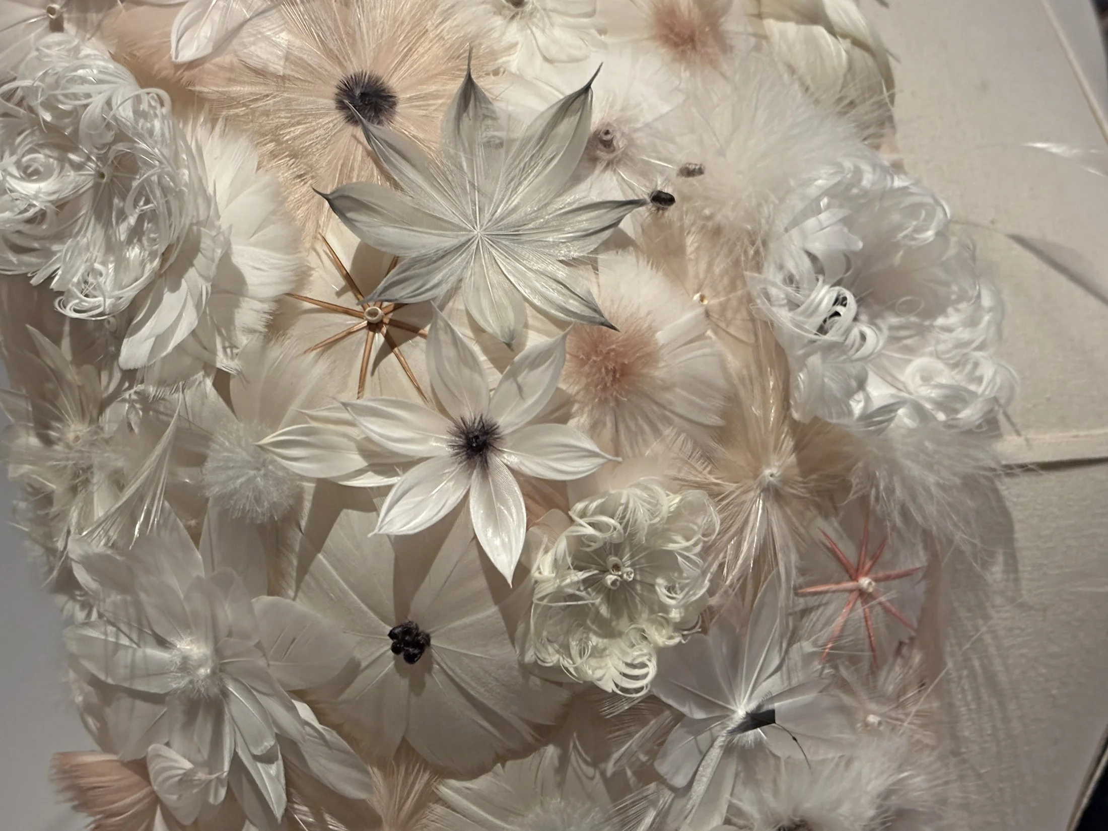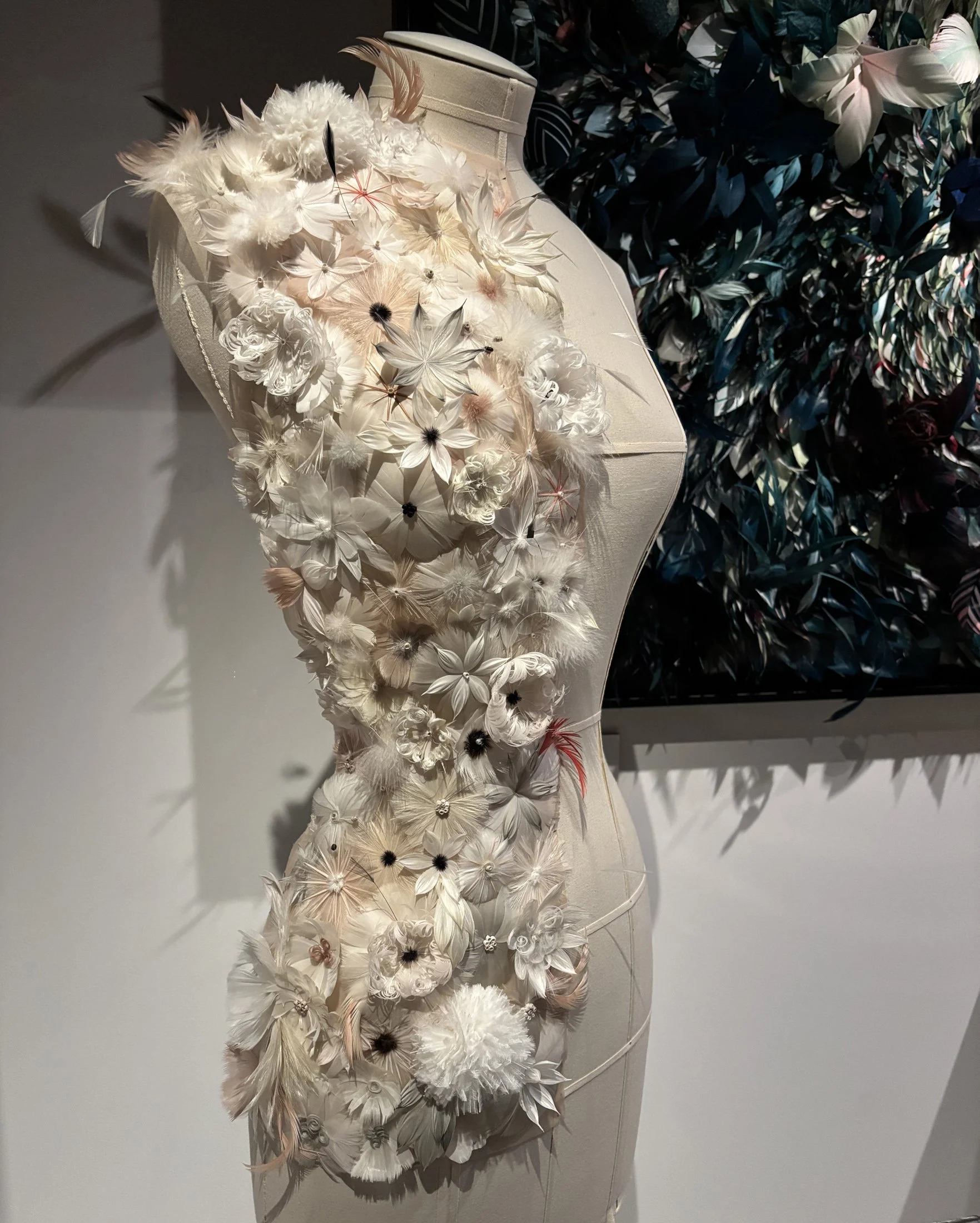 Apparentée à la création florale, la plumasserie, réalisations avec des plumes, s’est aussi développée en lien avec la mode. Ce savoir-faire se perpétue, on le voit ici avec cet ornement actuel de toute beauté.