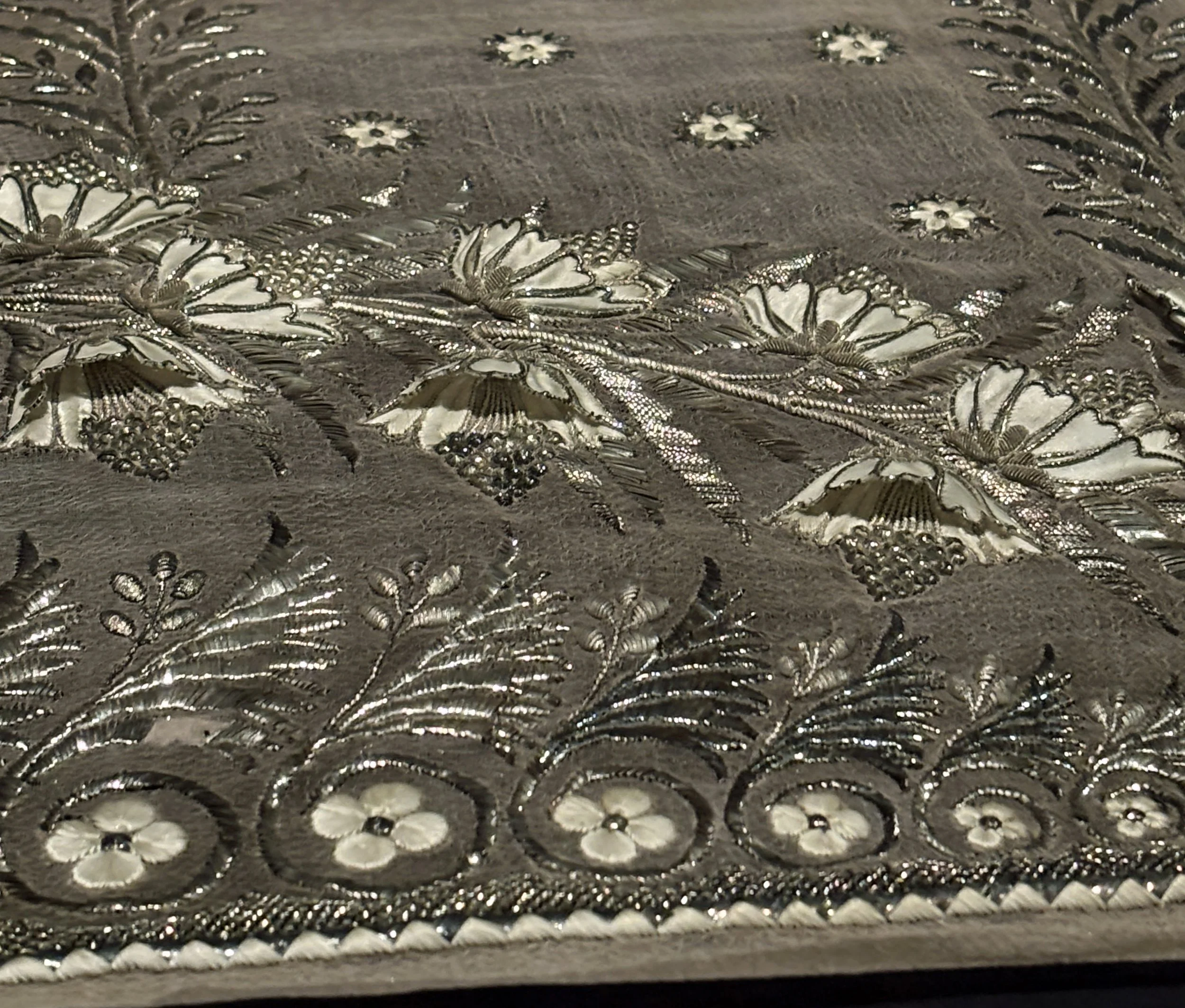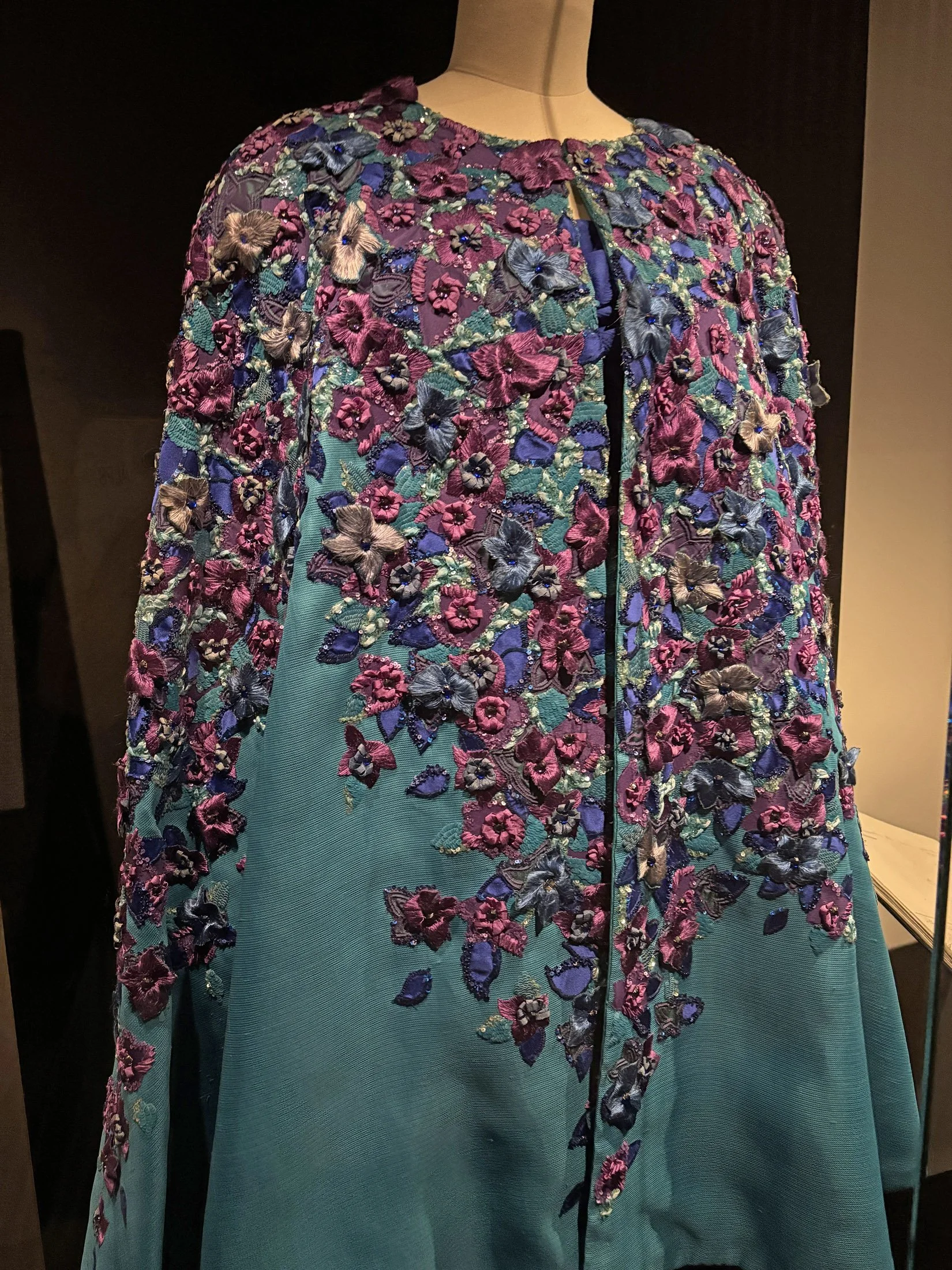 Et pour terminer, cette magnifique cape, signée Yves St Laurent, ornée de broderies réalisées à l’atelier Lesage…